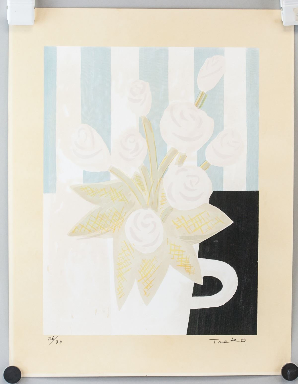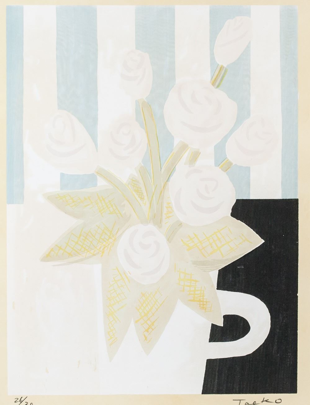 Japanese screenprint on paper. Featuring bouquet of white flowers. Signed "Taeko" to the bottom right. Numbered "26/30" to the bottom left. Sheet: 51 x 39 cm. Provenance: Private collection, Philippines