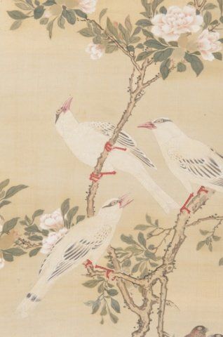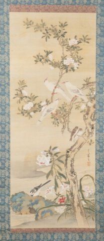 A Japanese hand painted scroll. Early 20th century. Scene of birds amongst flowers. Watercolor and gouache on silk. Calligraphy and seal l.r. Image: 40" x 16"