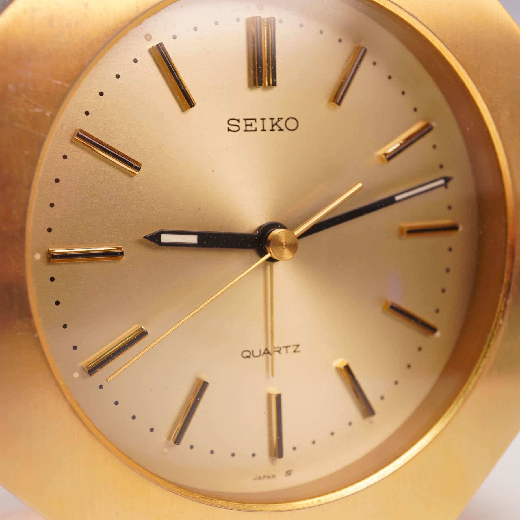 A Japanese Seiko quartz alarm clock housed in a brushed gold tone octagonal case with a matching gold dial, applied baton hour markers, and black and white hands. The clock features a rear alarm adjustment dial and on/off switch, and is battery operated. Marked Seiko Quartz and Japan to the dial and back panel.