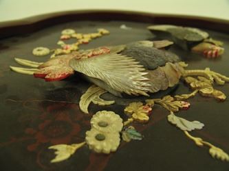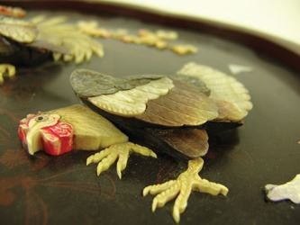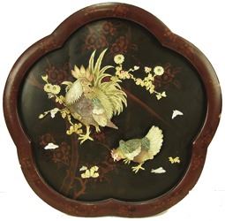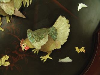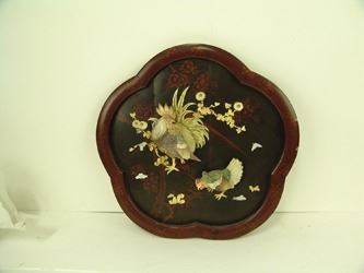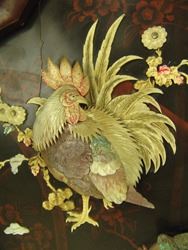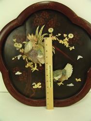 Clever and artful, handcrafted scene showing a rooster and a hen, all done with hand cut, carved, shaped, colored, and set pieces of shell, and done in fine detail. Good condition, wooden background has cracks. Mid 1900s. 18" x "18