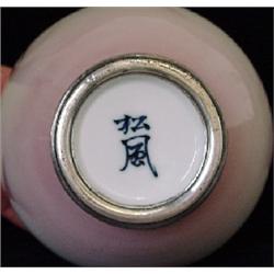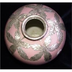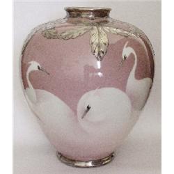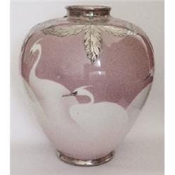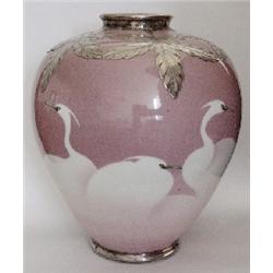 An ovoid shaped porcelain vase decorated with white cranes on a dusty rose colored background having engraved silver leaves by Shreve Co. circa 1910 overlaying the mouth and shoulder and resting on a silver foot. Fine condition with a loss to a silver a stem on the shoulder. Japan, 19th C. 7" (17.75 cm) H.