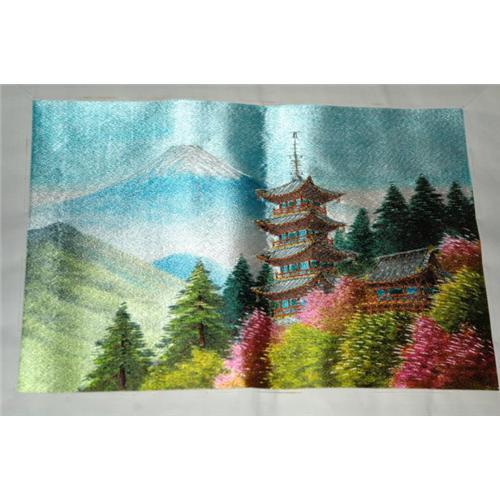 Lovely and skillfully all silk embrioder picture of Mount Fujii with house and pagoda. The emboidery is very tight with raised texture stitches over flower and part of the trees and the snow cap on the mountain and trims on the buildings. The colors are brilliant. There transition from lighter areas to shaddy area and the blend of colors looks so natural. It is so well crafted that I thought it was a painting. It is sewn on the a paper back that serves as a tempoary matt. I did not find a signature but it could be under the border of the paper. <p> The condition is good. There is a crease down the middle from being folded that will iron out. The border of the paper it is sewn on is wrinkled up. There are not stain of pulls. <p> It is a remarkable piece of art and skill. .