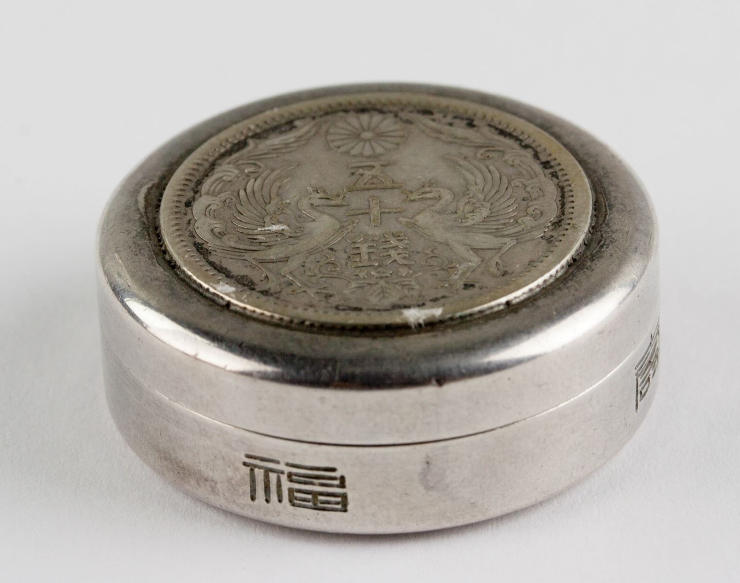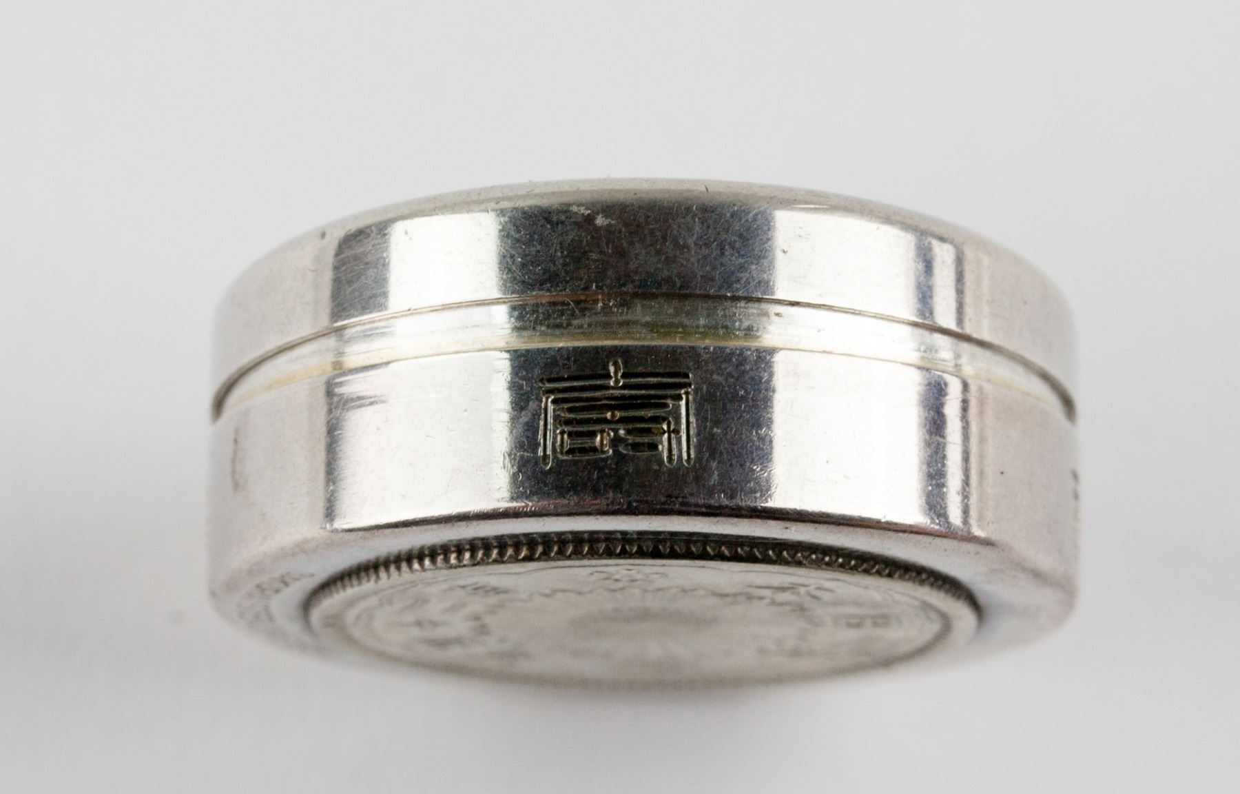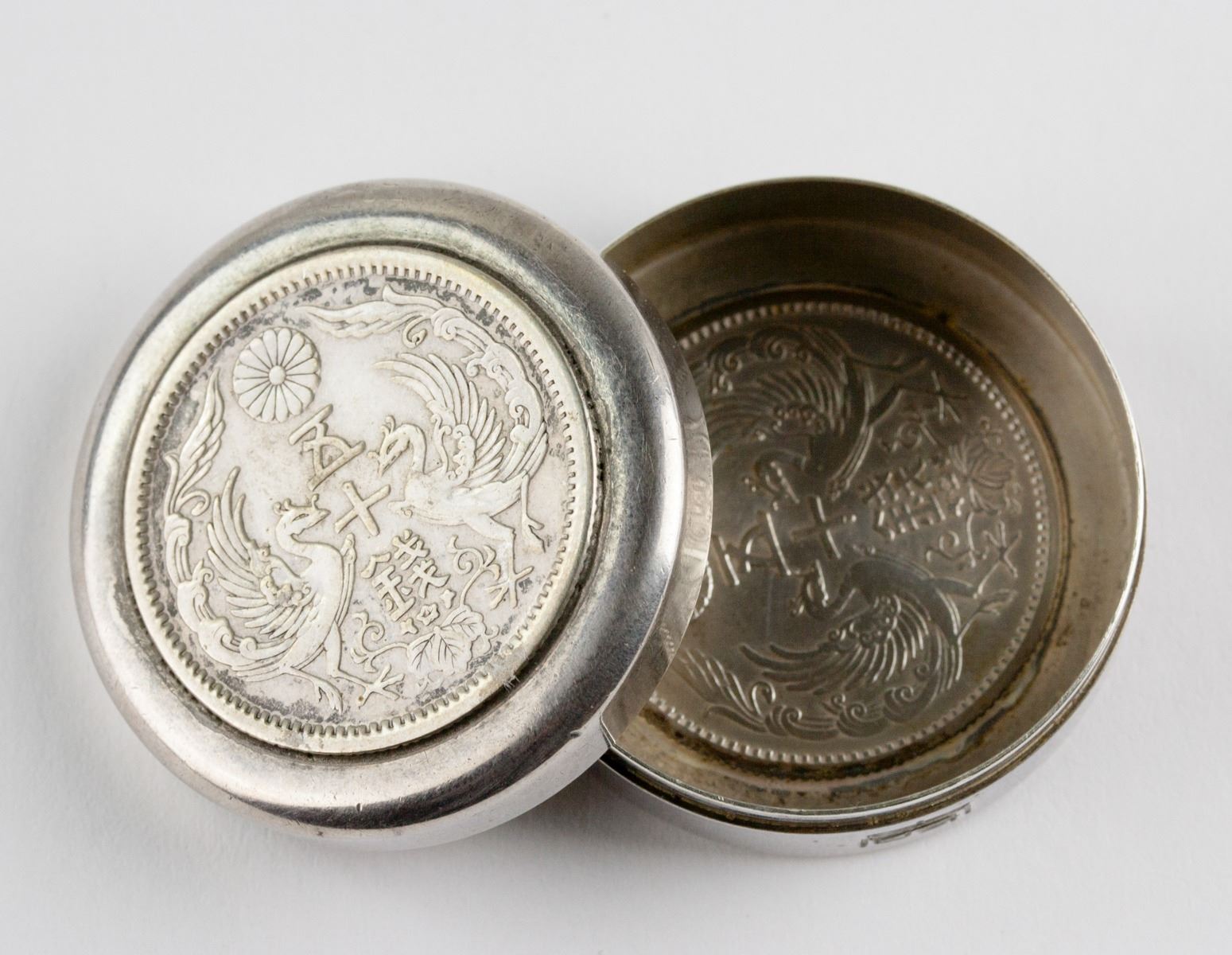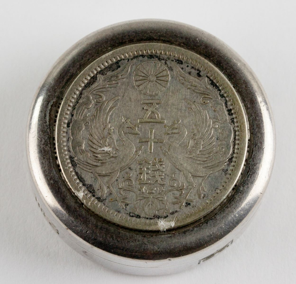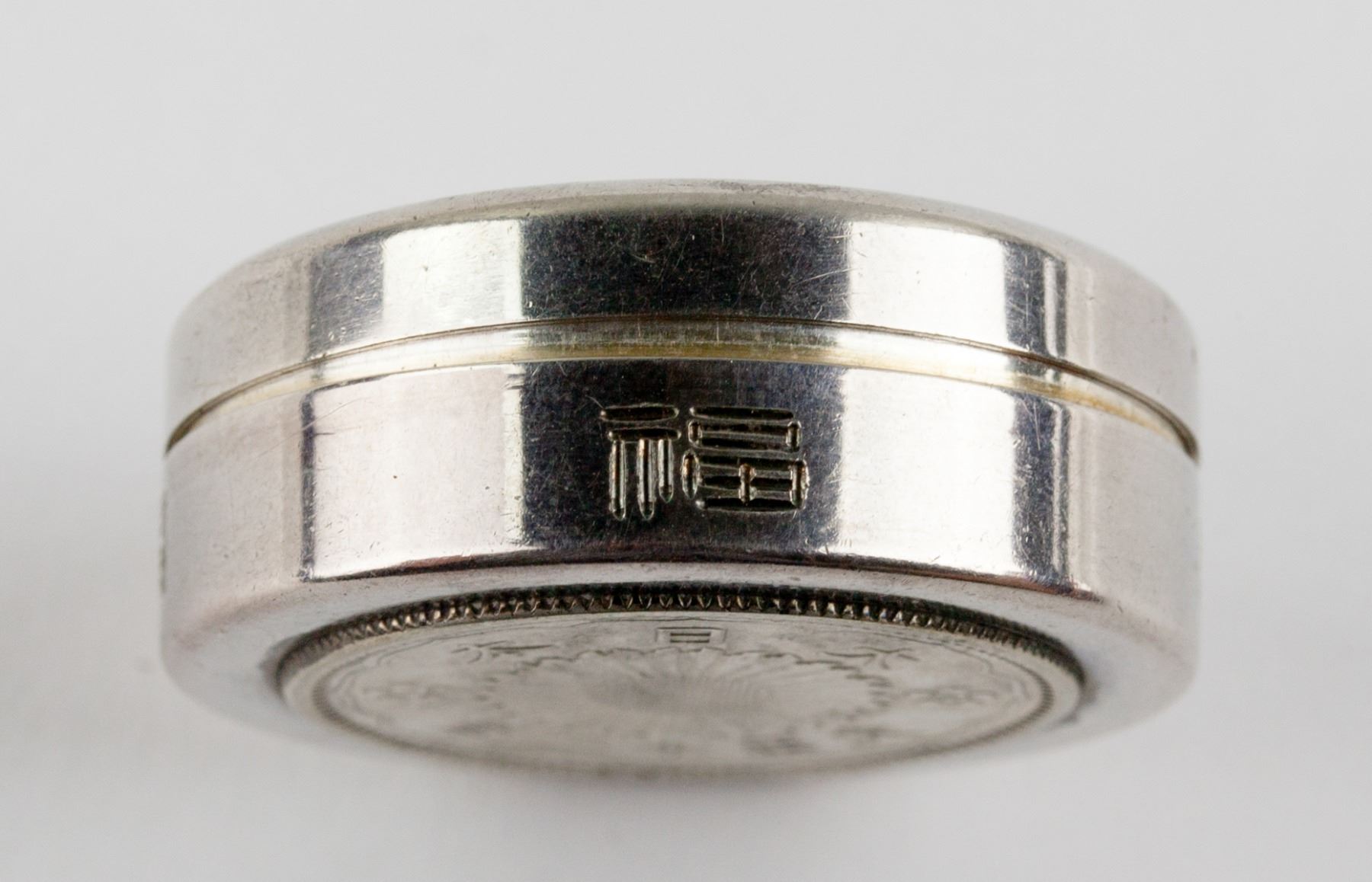 Japanese silver coin inset case; featuring two silver coin insets with Taisho Twelfth Year and Taisho Eleventh Year mark; Sterling 950 & Made in Japan mark on covers, carved Fu and Shou characters on rim; D: 27 mm, 17 grams; silver not tested for purity; Provenance: private collection from Canadian numismatist