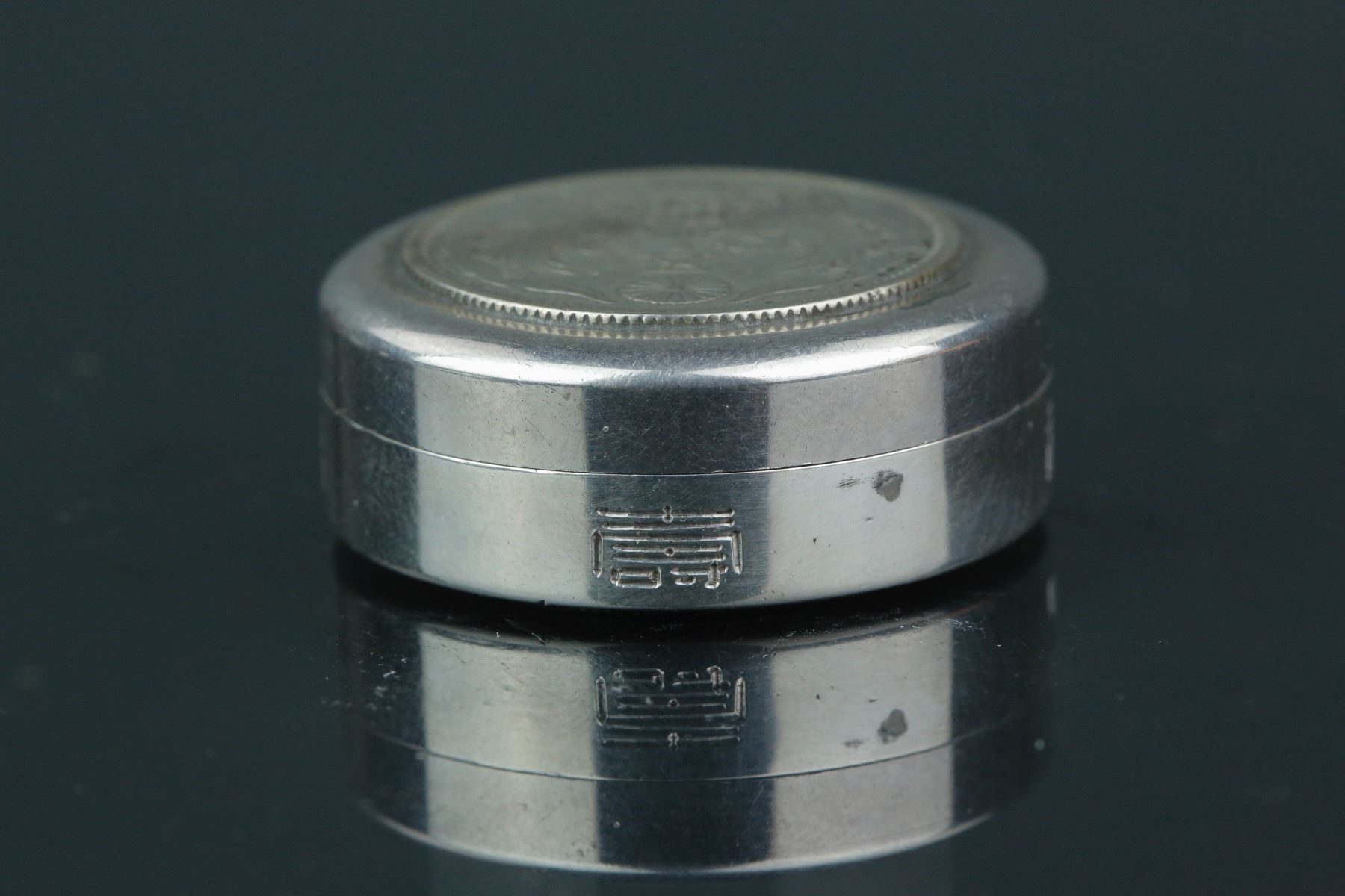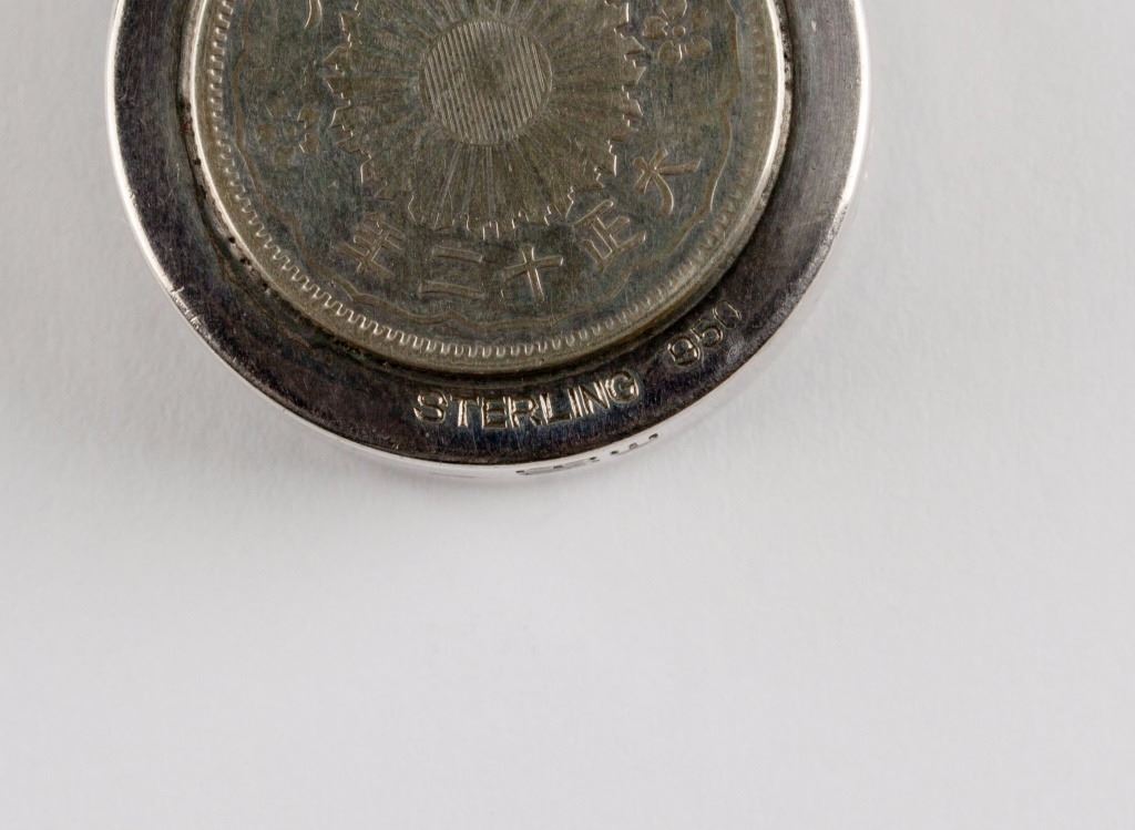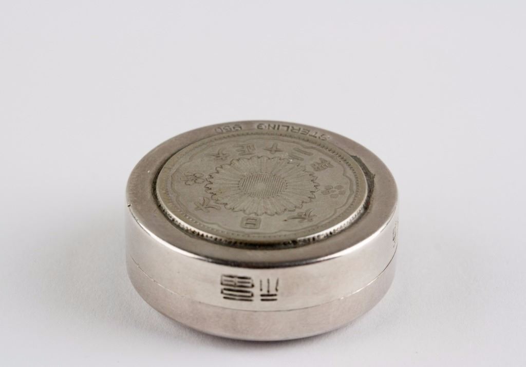 Japanese silver coin inset case; featuring two silver coin insets with Showa Third Year mark and Taisho Twelfth Year mark; Sterling 950 & Made in Japan mark on covers, carved Fu and Shou characters on rim; D: 27 mm, 17 grams