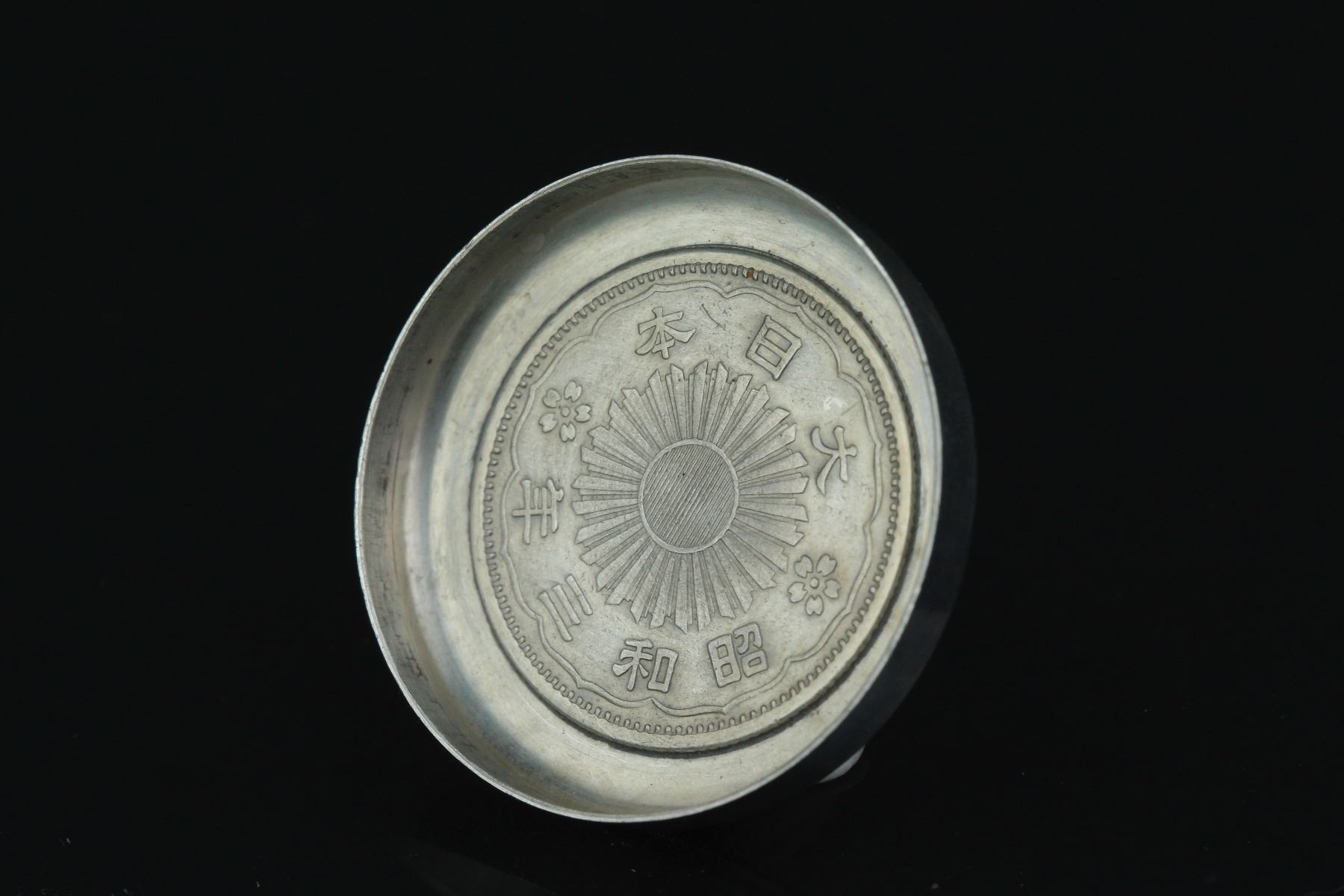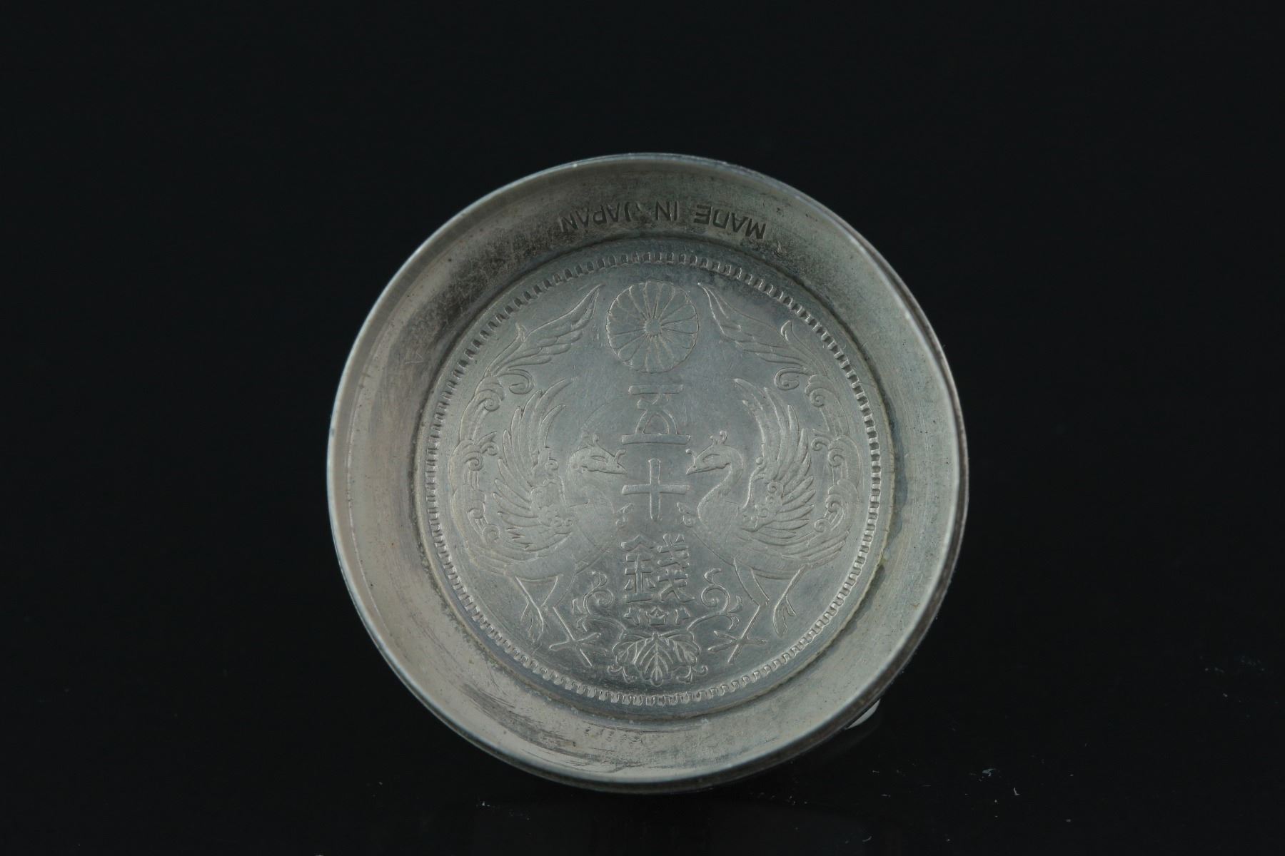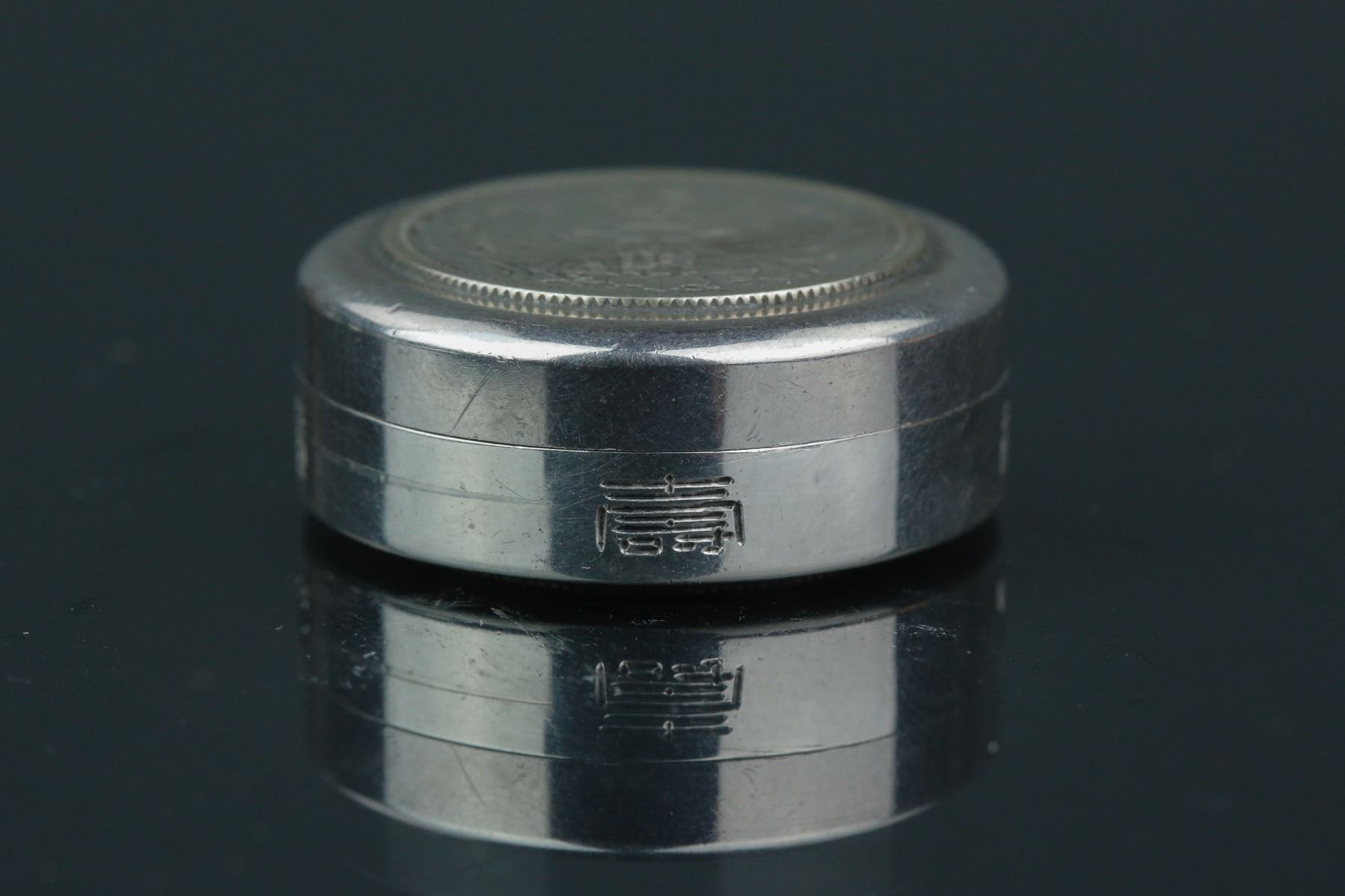 Japanese silver coin inset case; featuring two silver coin insets with Showa Third Year mark and Taisho Twelfth Year mark; Sterling 950 & Made in Japan mark on covers, carved Fu and Shou characters on rim; D: 27 mm, 17 grams