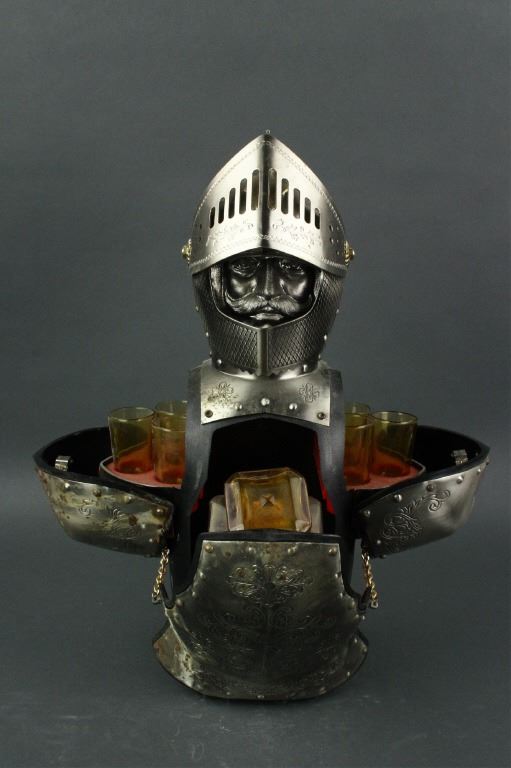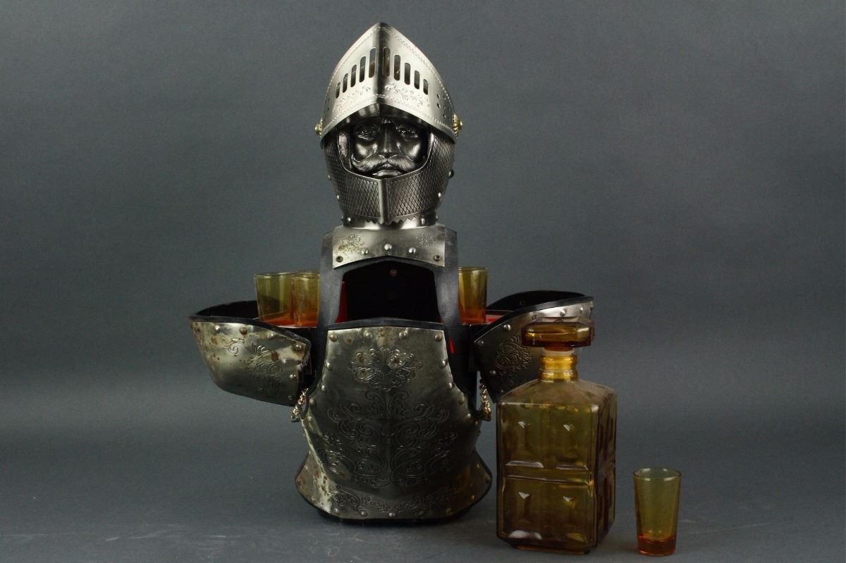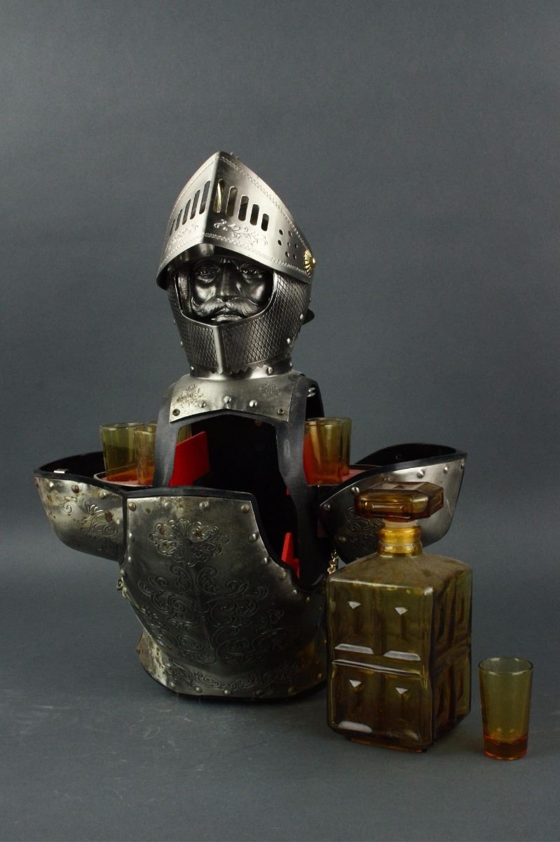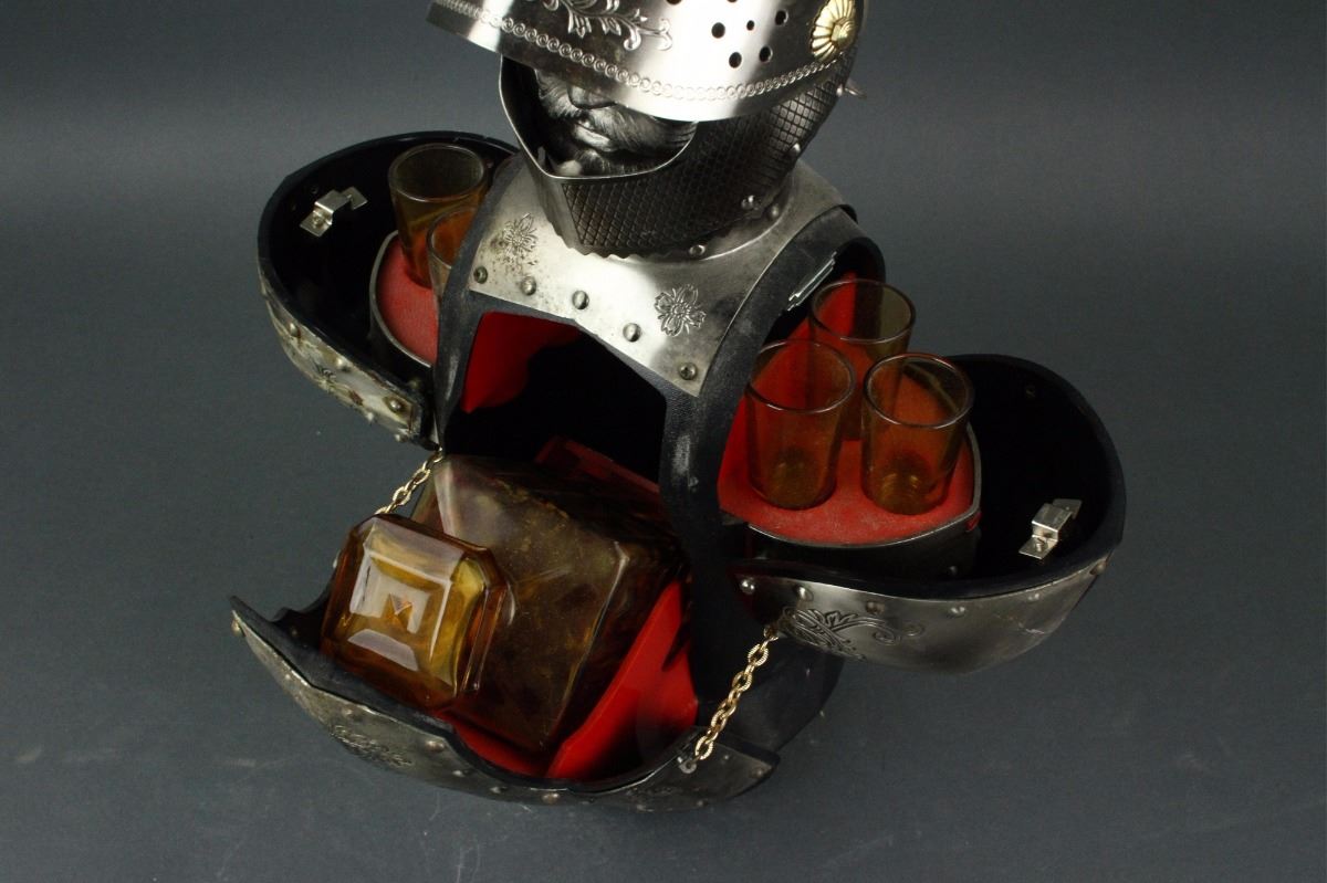 Japanese silver wine bottle holder; the chest storing one square glass wine bottle and the shoulder storing six wine cups; H: 40 cm, W: 16 cm, 2695 grams