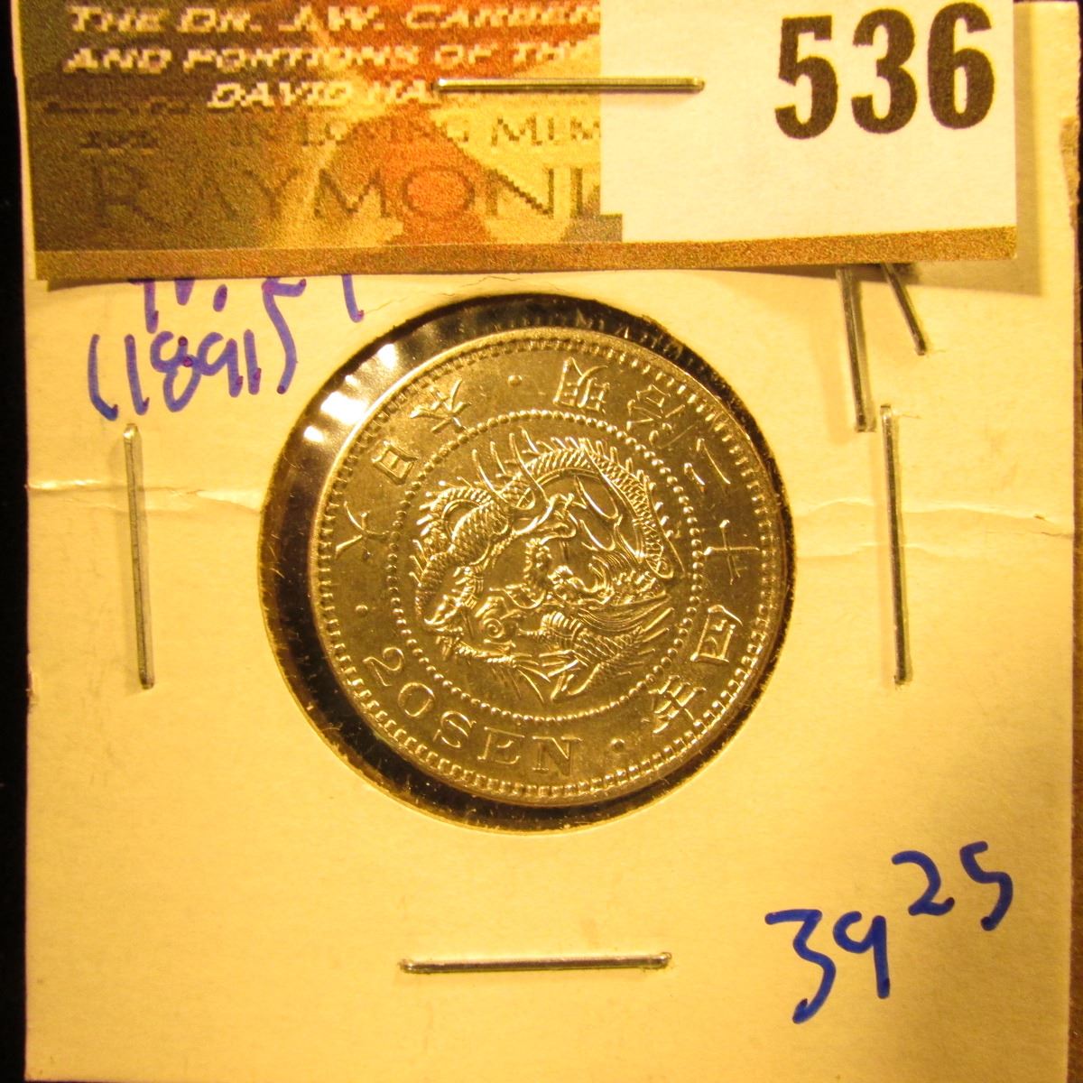 Japanese Silver Year 24 (1891) Coin 20 Sen