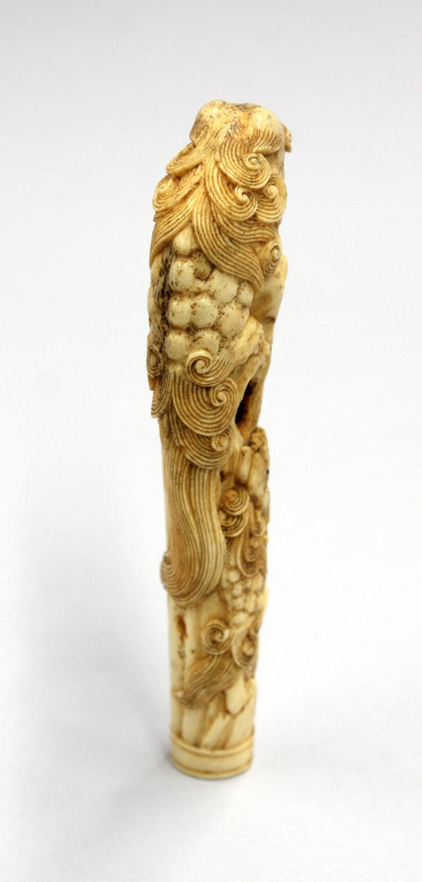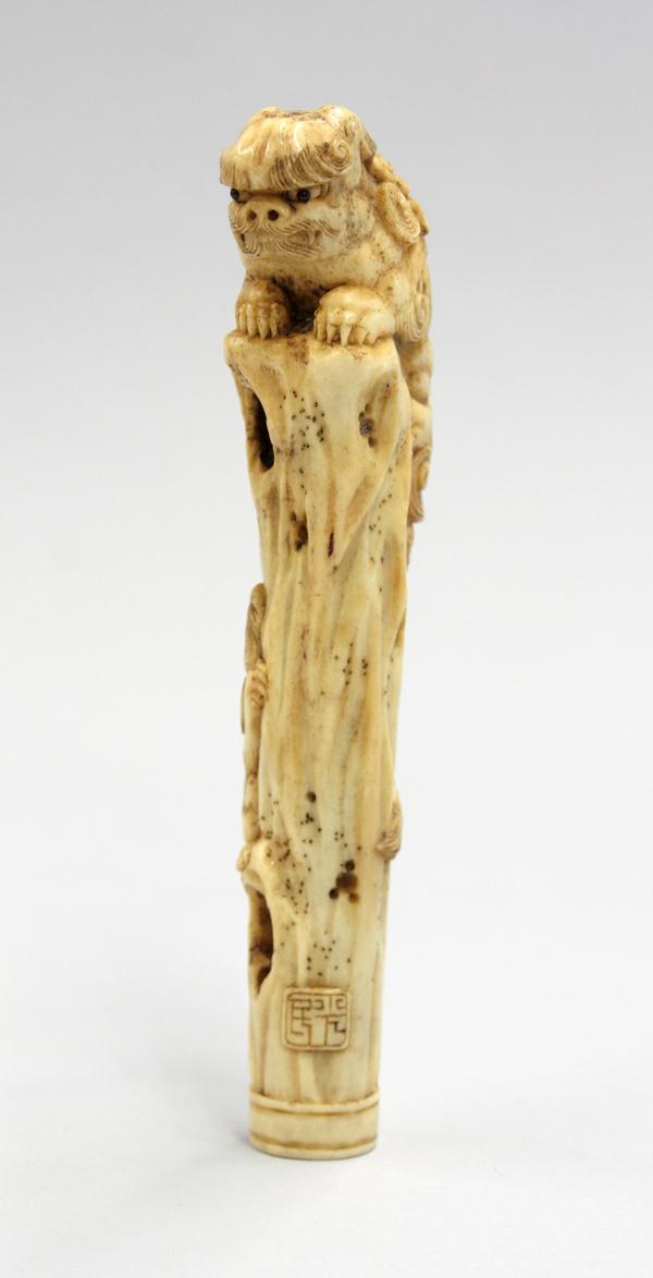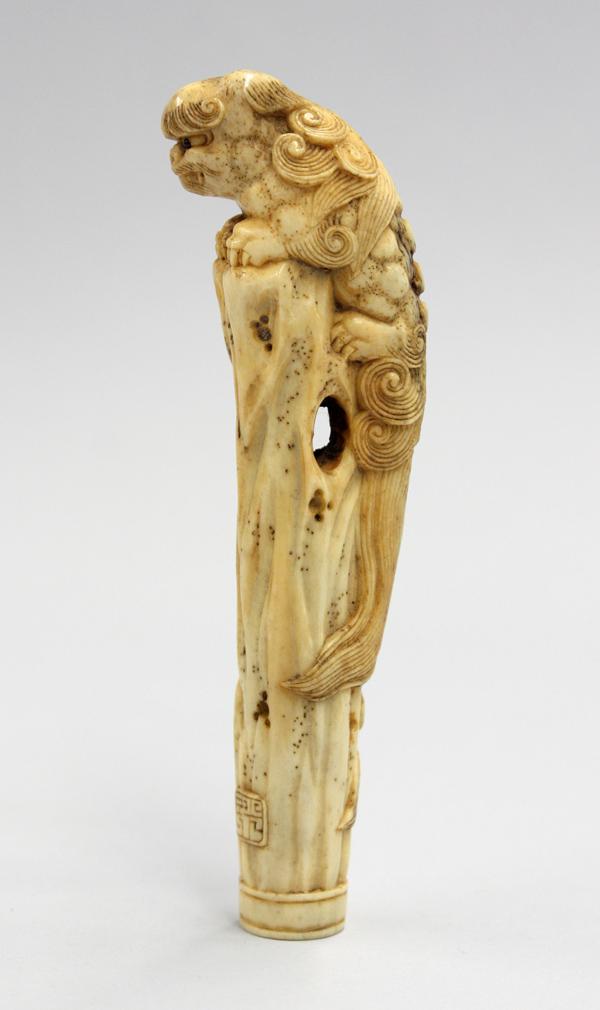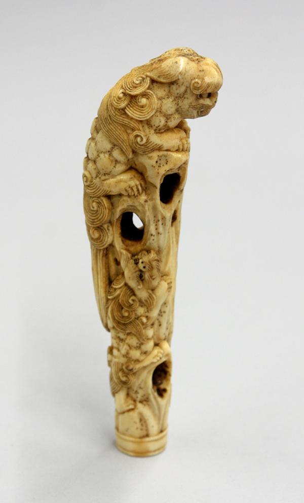 Japanese stag antler cane handle, Meiji period, delightfully carved as rocky outcropping surmounted by a humorous karashishi (Chinese lion) with a bushy mane and long tail, another of the leonine creatures climbing up the side, the natural surface inclusions incorporated into the design, with a cartoche reading Komin/Mitsutami, 4.5''l