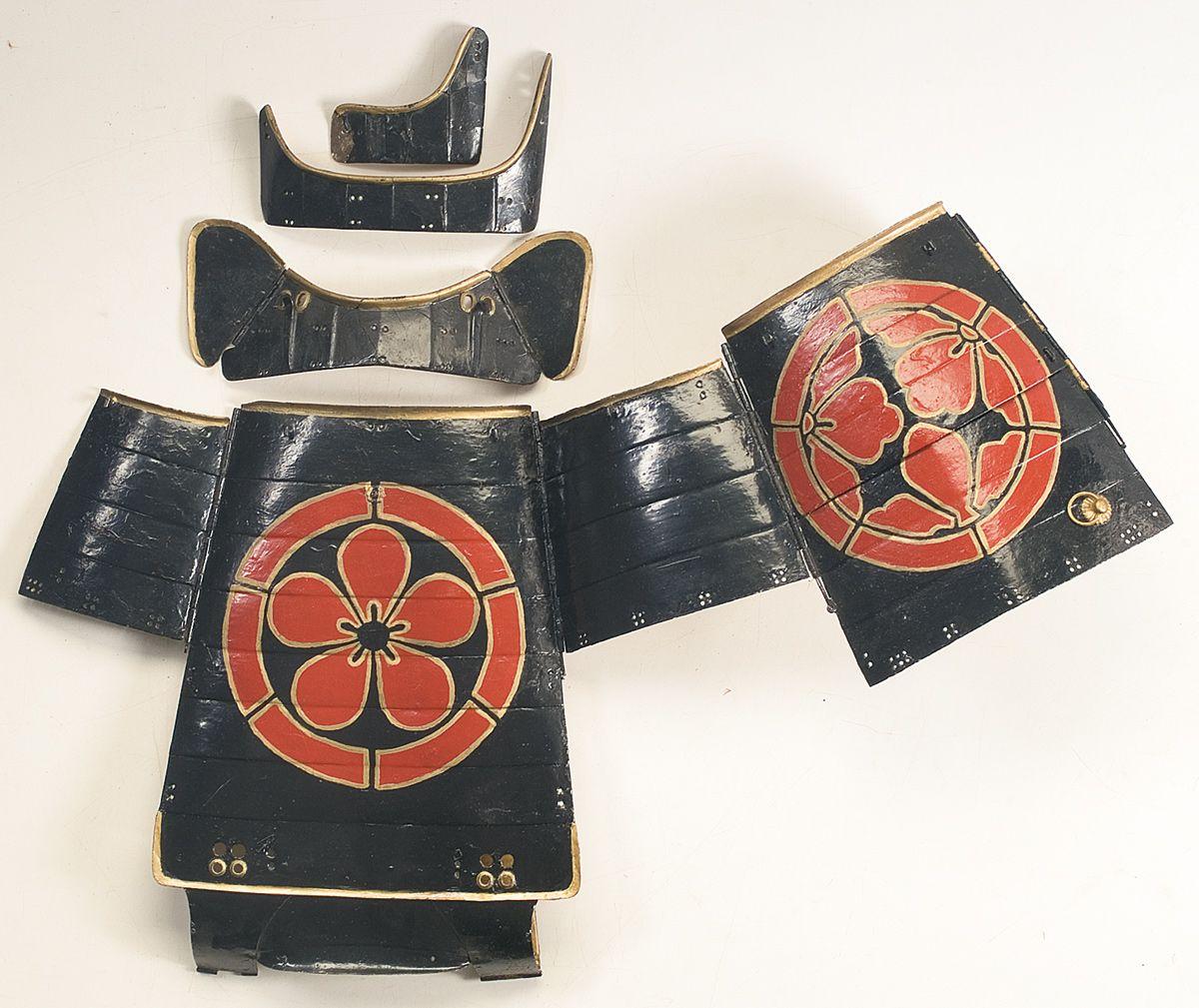 Laminar construction, with gold lacquer on the inside surfaces and trim, black on the exterior, with a red painted moon on the front. Some sections absent or repaired.