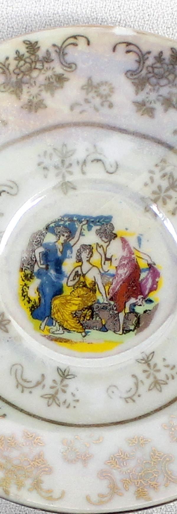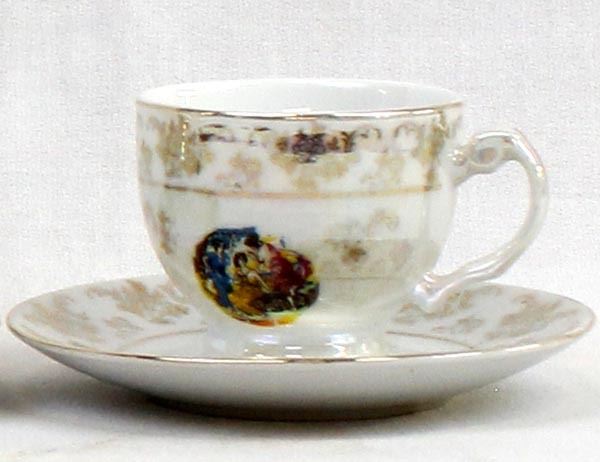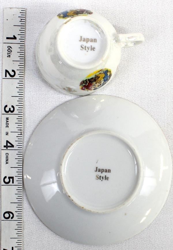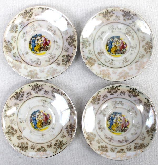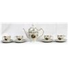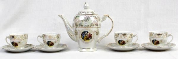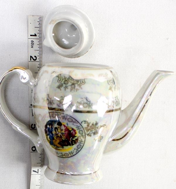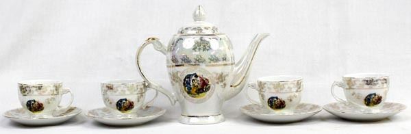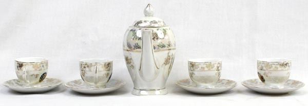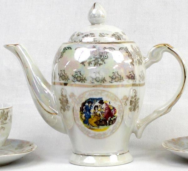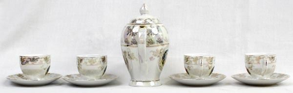 Japanese Style Gold Gilt Lustreware Teapot, 4 Cups, and Saucers, teapot measures 7'' x 8'', bottom of each is marked ''Japan Style''