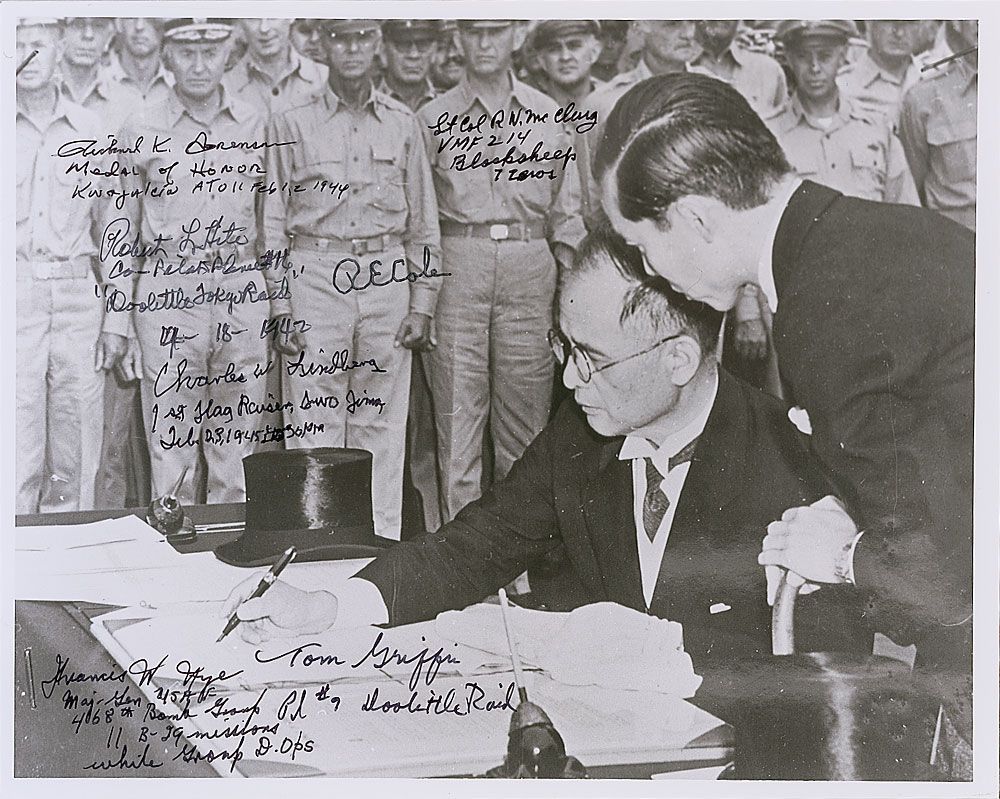 Glossy 10 x 8 photo of the Japanese signing the Instrument of Surrender, signed in black felt tip by seven: Richard Sorenson (MOH recipient), Robert Hite (Doolittle’s Raiders), Charles W. Lindberg (flag raiser), R. E. Cole (Doolittle’s Raiders), R. W. McClurg (Blacksheep Squadron), Tom Griffin (Doolittle’s Raiders), and Francis W. Nye (B-24 pilot). In very fine condition.