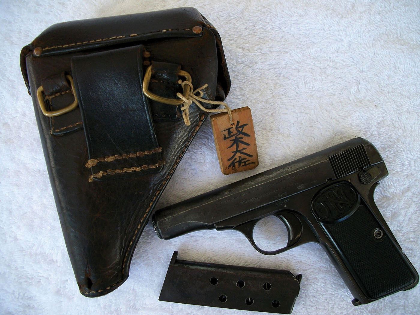 The Browning Model 1910 pistol is serial #367423, 7.65mm (.32 ACP), 3 1/4? barrel with a fine, bright bore that has some minor freckling within the grooves. This Liege-proofed pistol has matching numbers on the frame and slide with the metal retaining 75-80% of the original commercial blue finish that has gray fading along the raised edges and areas of dark freckling along the sides of the slide, as well as on the top radius. The checkered “FN” composite grips are in fine shape with some mild flattening of the points and a few minuscule handling marks and scratches. Additionally, the right panel has warped slightly and now has a narrow gap at the heel of the butt on the right side. The pistol comes with two “FN” marked magazines, and is housed in a private purchase Japanese military flap holster with single belt loop and brass shoulder strap rings. The leather is scuffed, but still flexible and intact, and a small wooden identification tag is tied to one of the strap rings. This transfers as a modern firearm.