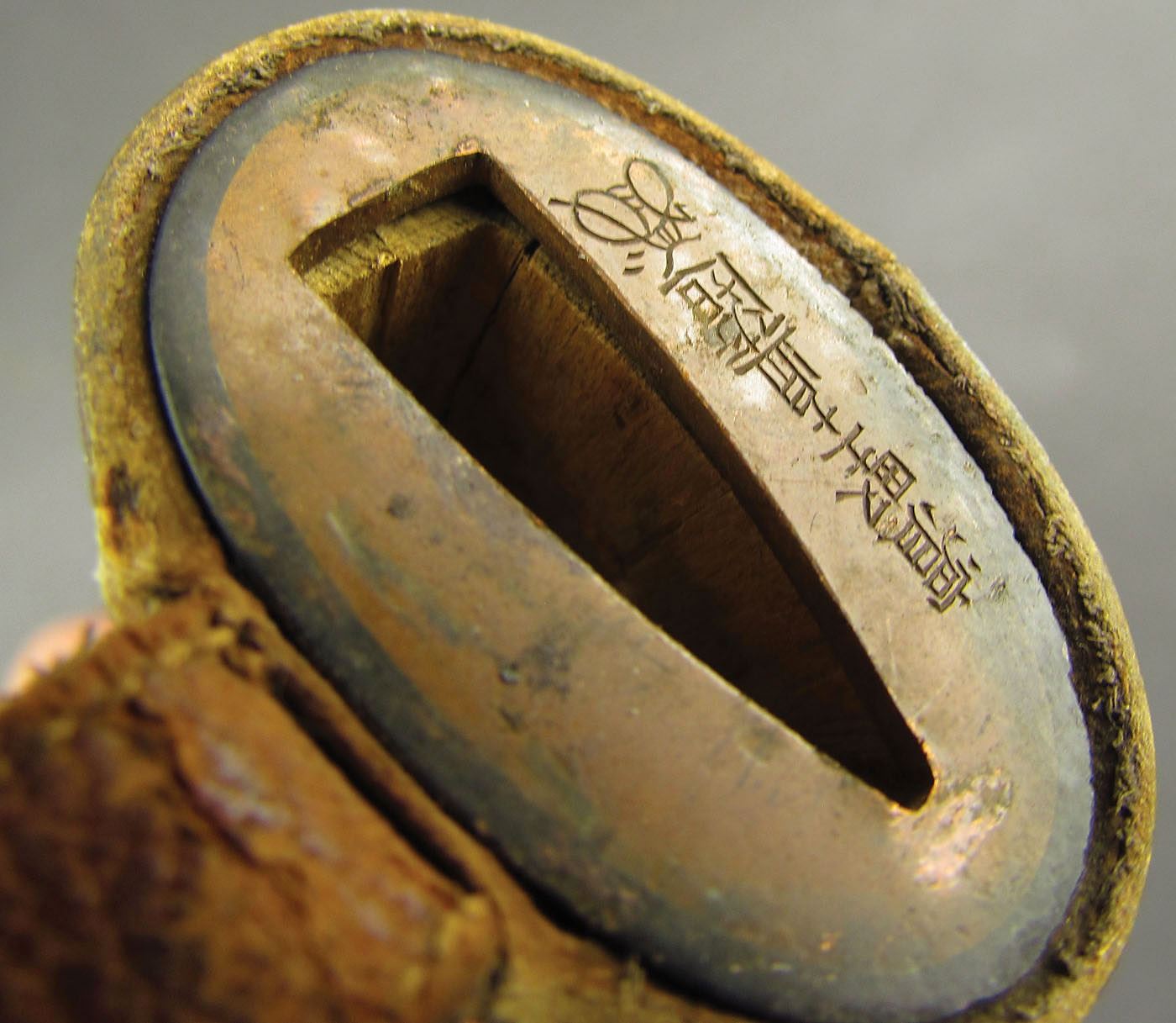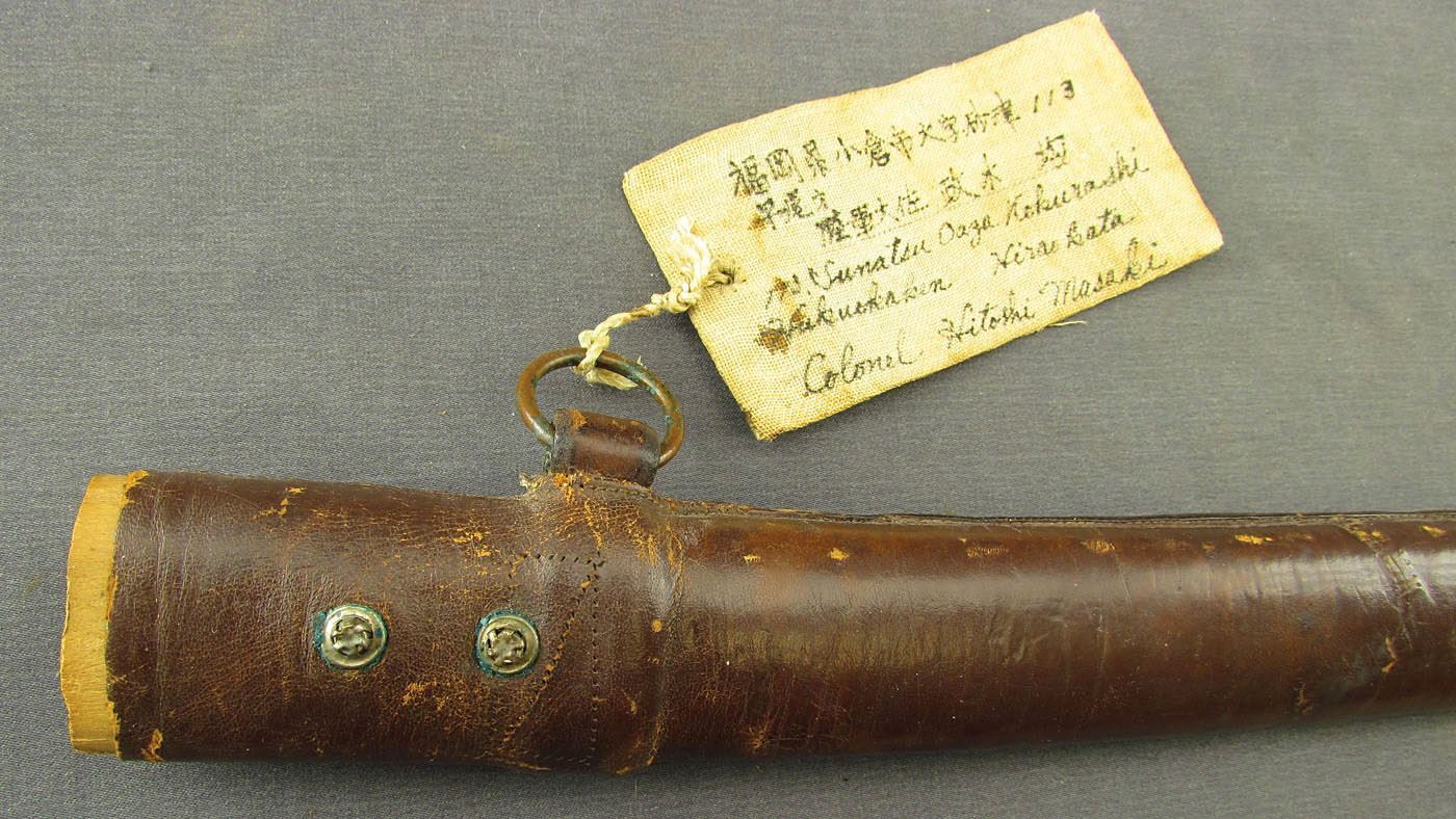 The wakizashi is an heirloom blade, not an issue or Showa era private purchase, and measures 31? overall with a 20 1/2? blade, signed on the tang by Banshuu-Juu Fujiwara Katsuuji (swordsmith in Harima and Osaka from 1661–1673). The sword mountings are not military and have ornate Kashira and Menuki (the Fuchi is covered by a military style leather collar with double snaps for securing the blade in its scabbard), as well as an iron Tsuba with abstract ‘cloud’ embellishments. The blade has numerous spots of freckling and minor scratches and blemishes along both sides, and is housed in a leather covered, wooden military scabbard. The leather has shrunk slightly and so the snap keepers are now slightly out of alignment. Attached to the hanger ring is a cloth identification tag with both Kanji and romanized information (including the name of the owner: “Colonel Hitoshi Masaki”).