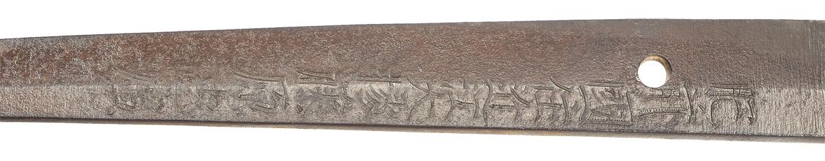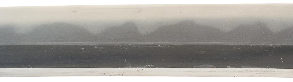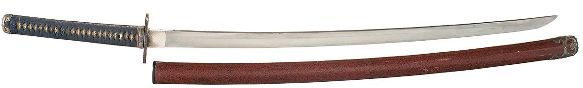Blade is 27" long, with a fine wavy hamon, silver habaki, and silver banded blackened copper seppa. Square profile iron tsuba, with raised and gold accented plant-themed engraving. Tsuka is fitted with a black cord wrap over white rayskin, with raised insect designs on the gold trimmed silver fuchi and kashira, and gilt leaf pattern menuki. Mekugi is absent. The nakago is hand signed (14 symbols) on the left side, with the right side blank. Red and black lacquered saya with black lacquered koiuchi, silver kojiri with raised insect designs and absent kurigata.
