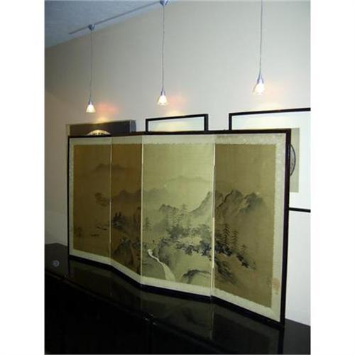 This antique four panel folding Japanese screen is silk with a painted scene of mountains and a man walking over a bridge, handpainted, signed and sealed by the artist. This gold silk screen is stunning with the black wood frame and it in very good/ excellent condition. This screen can stand or be hung on the wall.