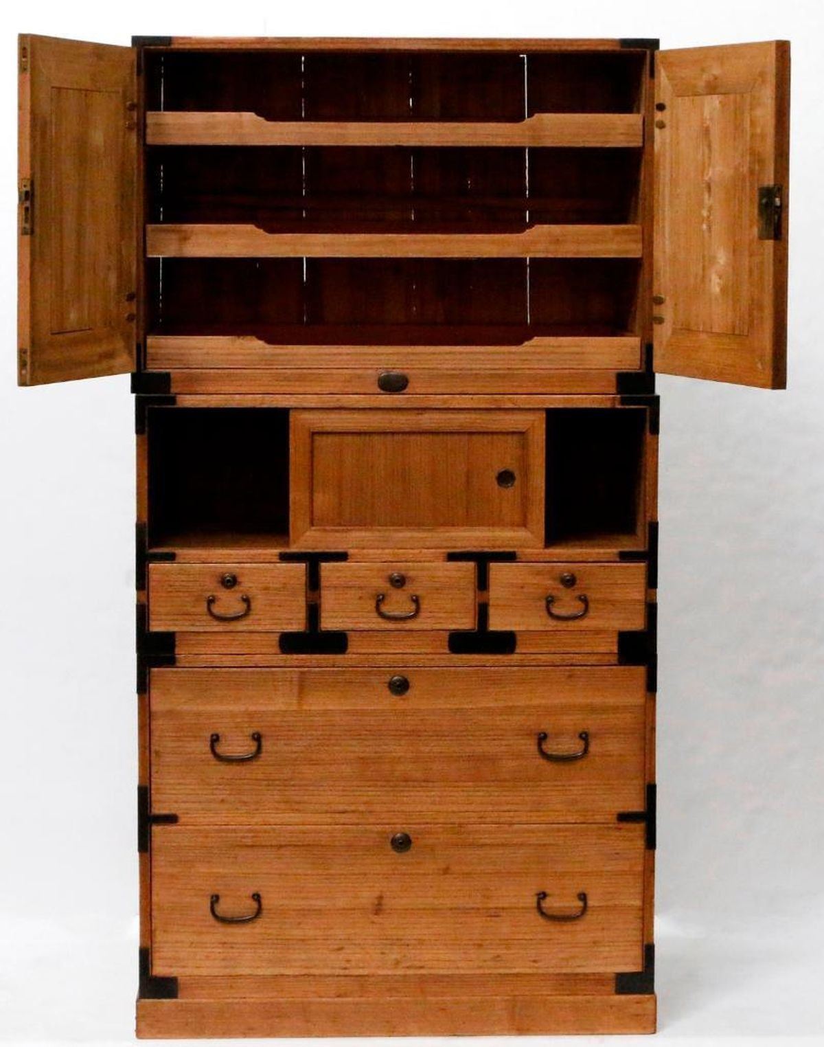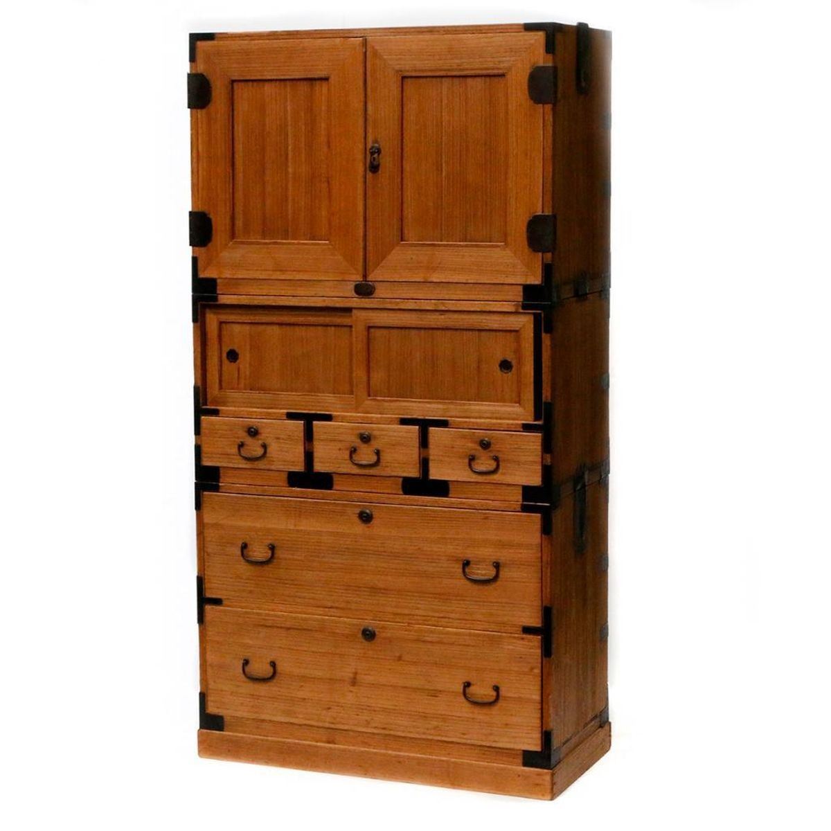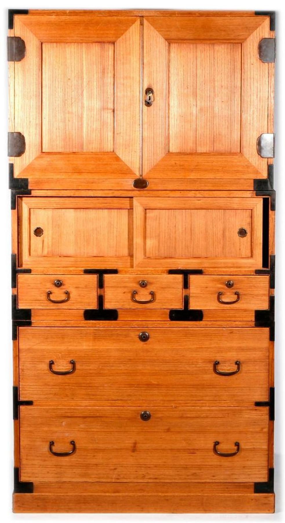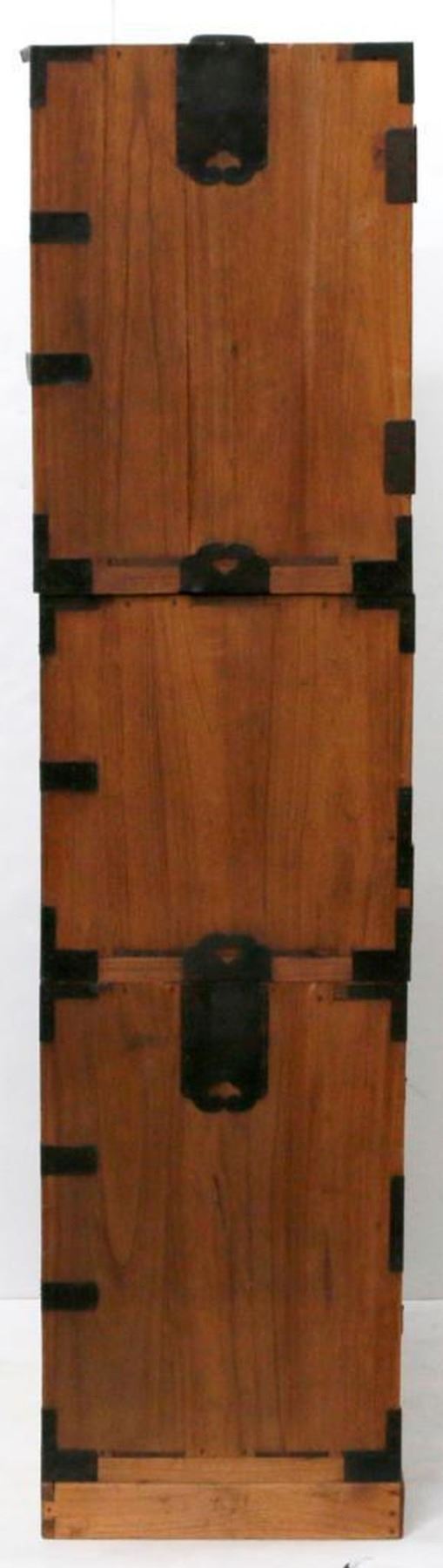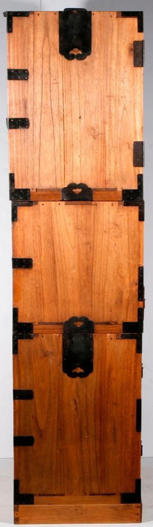 A Three piece Japanese Tansu measuring 66 inches high x 34 1/4 wide x 16 1/2 deep.