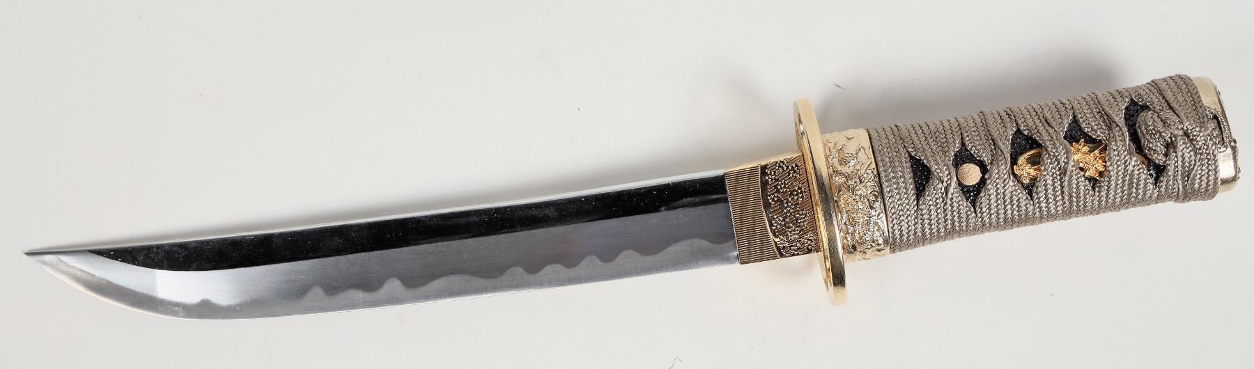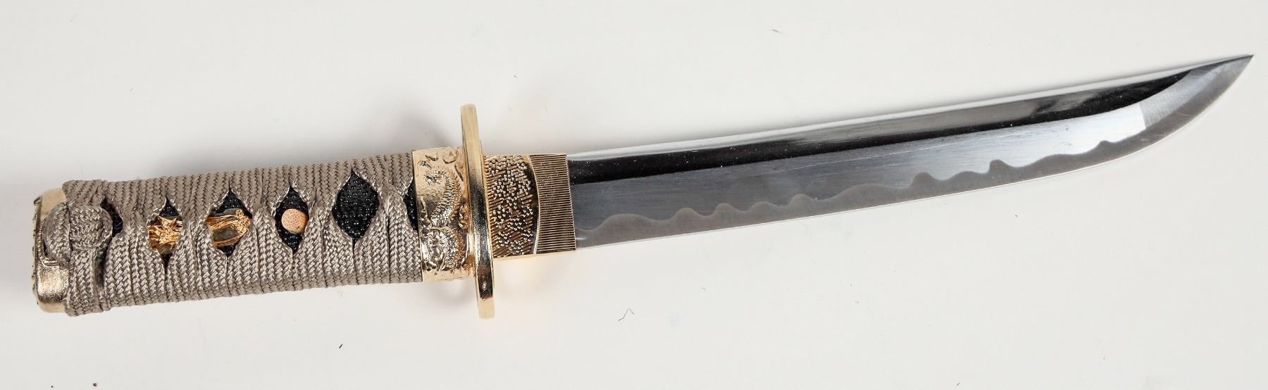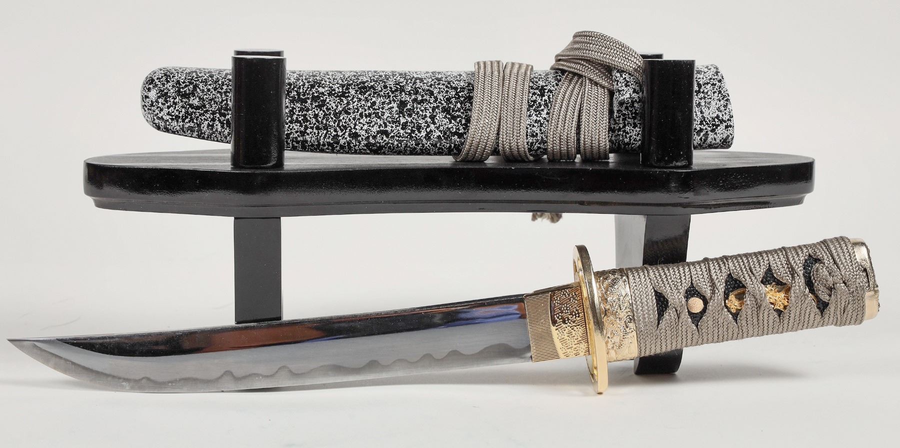 This Tanto knife has everything except an edge. This knife is for display purposes only and includes a sheath, a hamon line, a black enameled display stand, and good luck charm but no edge! The paperwork that accompanies the knife reads" REPLICA" IN THREE LANGUAGES (ENGLISH): "Imitation Sword/ THIS ITEM IS NOT WEPON, USE FOR TOY PURPOSES OR DISPLAY ONLY!" No makers mark, quality craftsmanship. Please see photos for details.