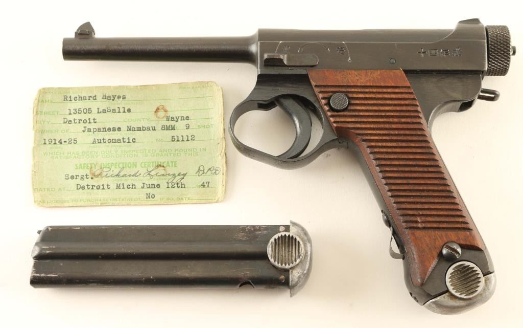 ‘Second Series’ WWII era Japanese military striker fired semi-automatic service pistol chambered in 8mm Nambu, manufactured at the Nagoya Arsenal circa 1944. Features a blued finish, 4.6" barrel, dovetailed inverted 'v' front sight, fixed square notch rear sight, rounded trigger, large trigger guard, knurled cocking piece, manual safety on the left side of the frame, magazine disconnect safety, push button magazine release, 8 round magazine, steel frame with lanyard loop on the rear and grooved wood grips. Matching serial numbers are found on the barrel extension, bolt, cocking piece, locking block, trigger guard, magazine catch, magazine, frame and both grip panels. No import marks have been observed. Includes a matching spare magazine and a 1947 dated Safety Inspection Certificate issued to Richard Hayes of Detroit, MI. Pistol retains approximately 90% of its original blued finish showing thinning, a bright drag line on the frame from the safety lever and a small amount of scattered light surface rust. Action is sound, the bore is excellent, and the wood grips are fine. Condition is NRA Very Good. ***C&R Firearm***