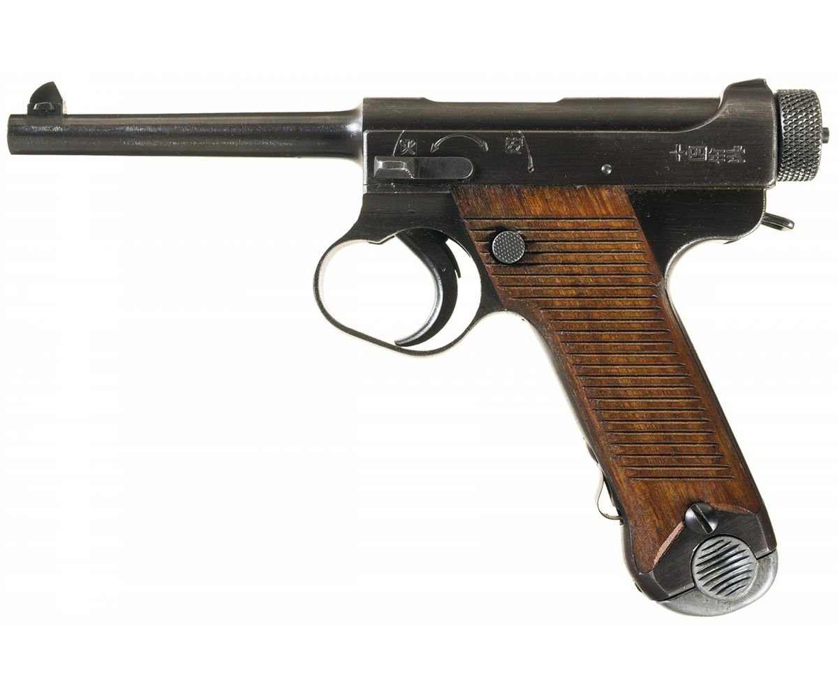 This is a exceptional all original, unaltered and matching late 1944 Japanese Nambu rig. These were the standard WWII Japanese Army sidearm used by all NCO and officers. This pistol has the Showa date of 19.2 (Feb 1944) and includes two matching magazines and an earlier Nambu leather holster. This pistol has the large trigger guard introduced in 1940, two-piece mahogany grip panels with 17 grooves, finely knurled cocking knob and two blue magazines with alloy bases and cast grooves. Both magazines are stamped on the spine with the partial serial number "264". The pistol and all the various parts have the wartime salt blue finish. The right side of the receiver is stamped with the Nagoya Arsenal symbol, the Nambu kanji and the Kokumbungi factory mark, followed by the serial number "16264". The partial serial number "264" is also on the trigger and the top of the bolt. All of the visible serial numbers match. The pistol is complete with an original WWII leather clamshell holster which contains an original cleaning rod.