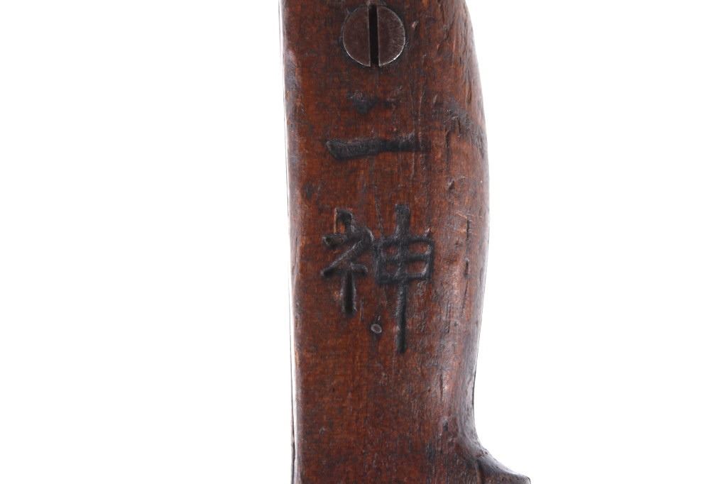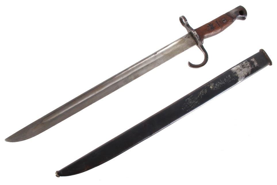 Featured in this lot we have a Japanese type 30 rifle bayonet with metal scabbard. The bayonet displays an unmarked singled edged blade with a fuller on both sides, steel guard, wood grips, and steel pommel/ attachment point. The wooden grips are marked with Japanese characters on one side and 95 on the other. The bayonet comes with a steel scabbard. The bayonet and scabbard shows good condition overall with some wear due to age and use. The bayonet and scabbard weighs 1lbs 2oz.