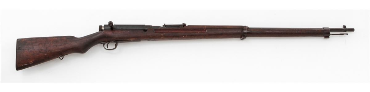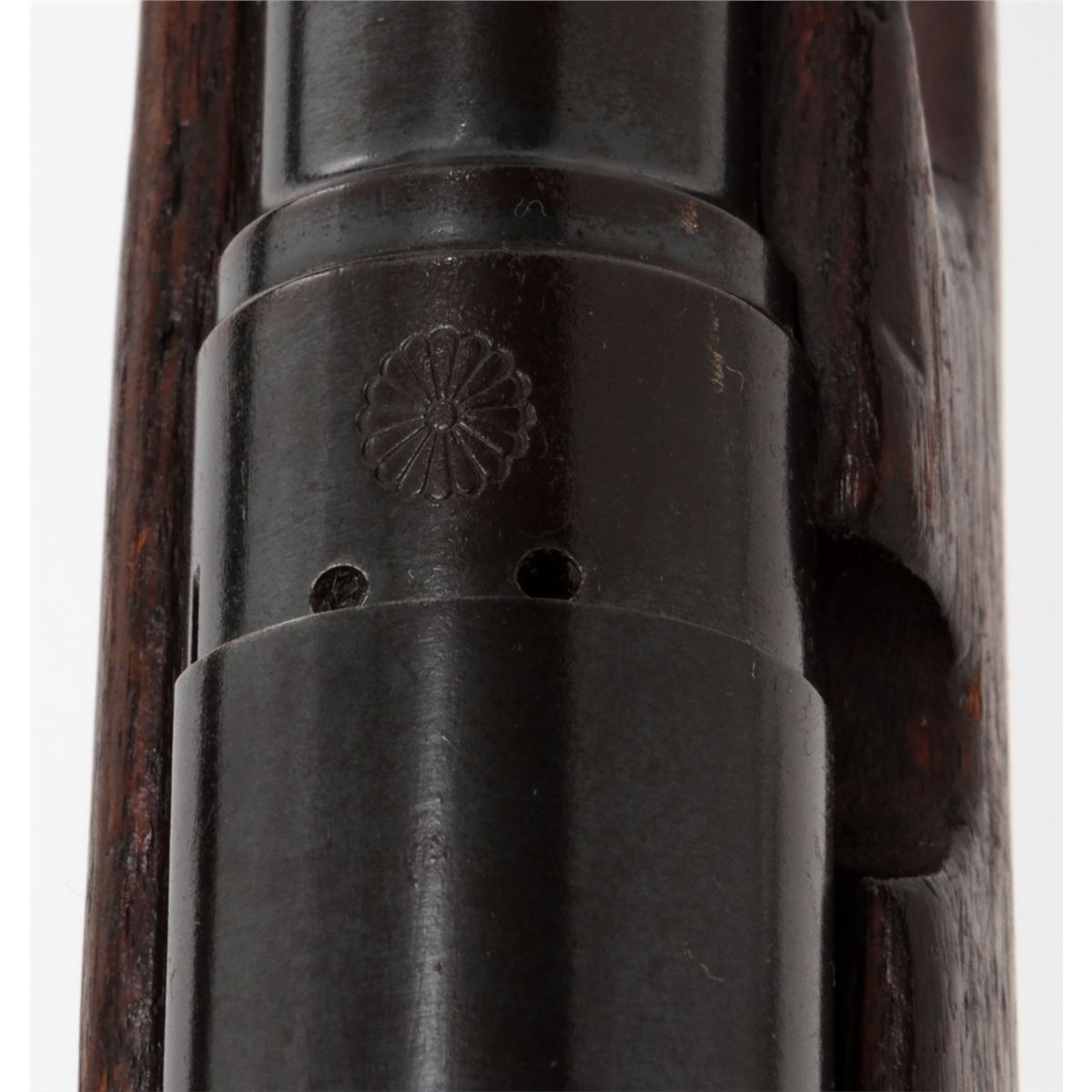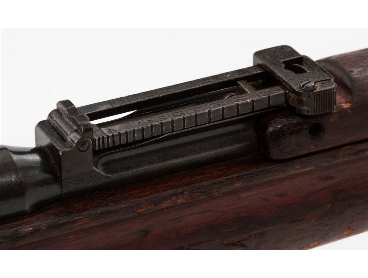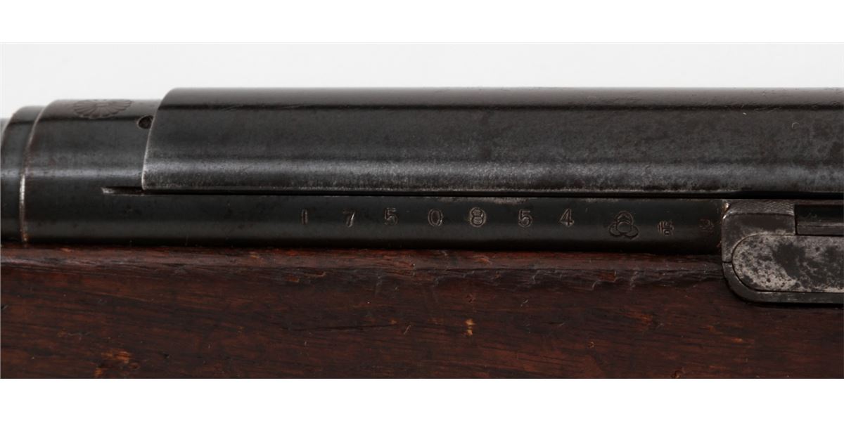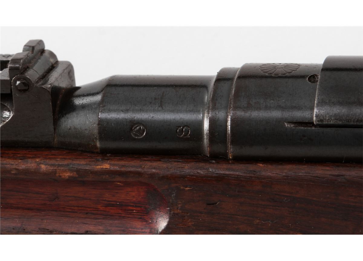 Japanese Type 38 Bolt Action Rifle, by Kokura, #1750854, 6.5mm, 31-1/2'' barrel, blue finish, Asian mahogany stock. Condition is very good retaining approx. 85% thinning and toning blue. Mum at chamber is intact; non-matching dustcover and cleaning rod are present. Stock with moderate to heavy scuffs and scratches, with one dovetail repair to left side at wrist. Action and bore are good. Est.: $350-$500. (C&R)