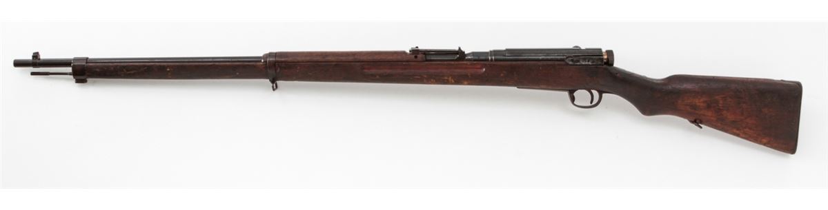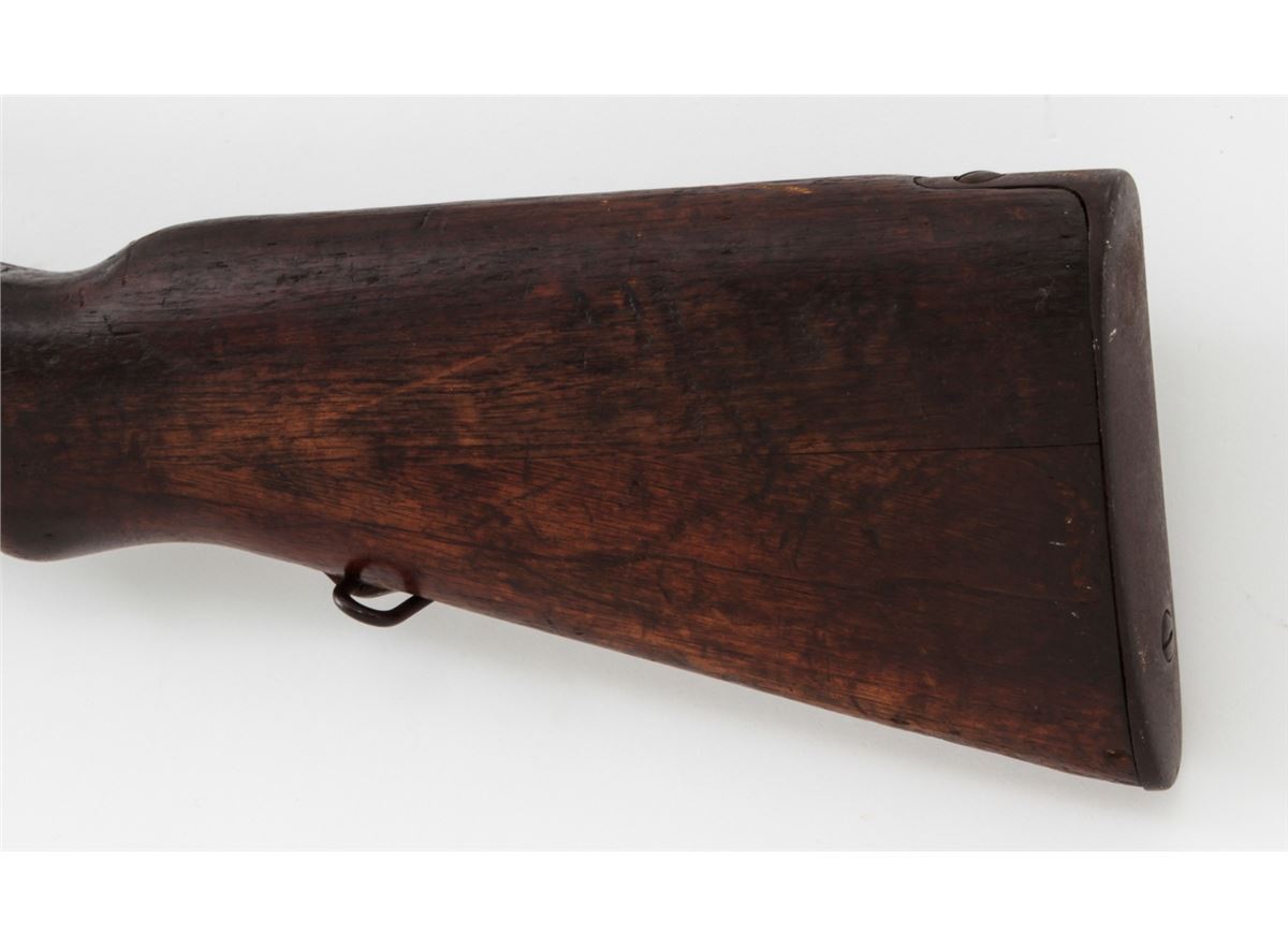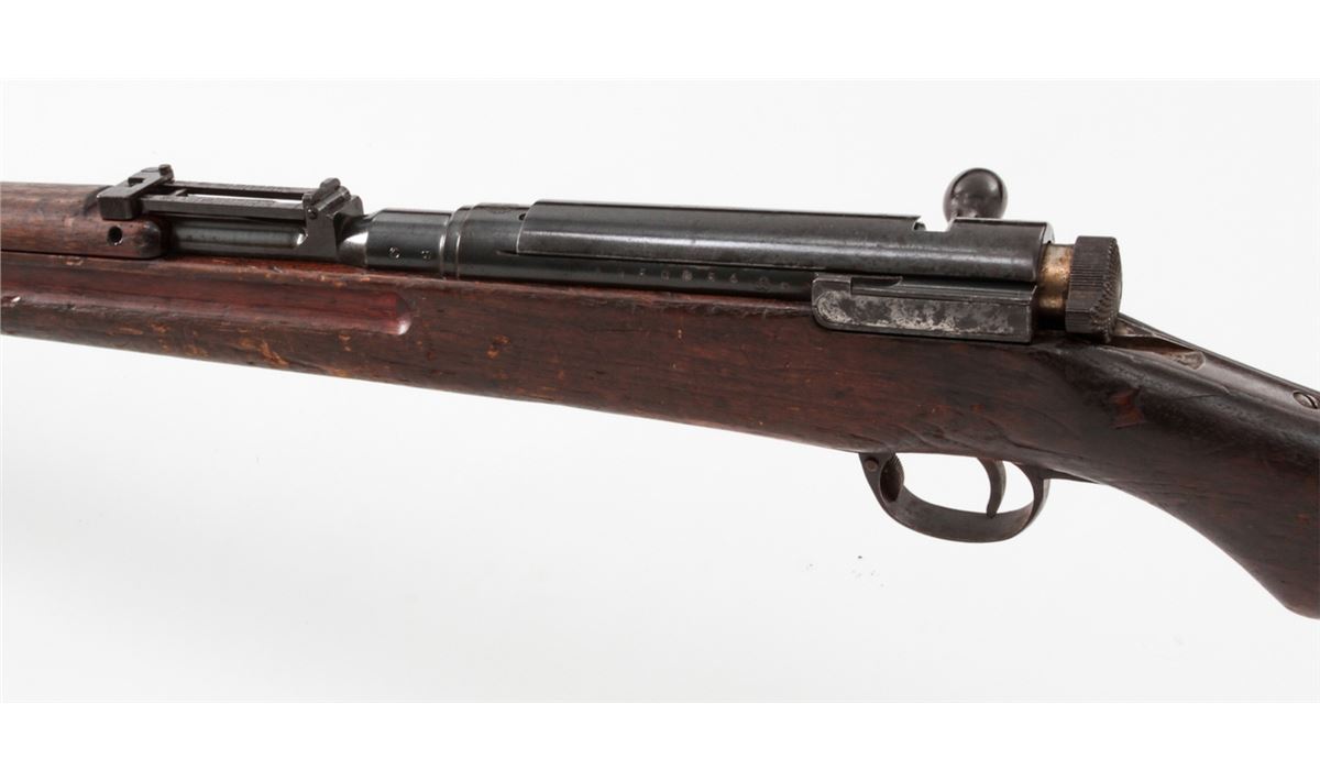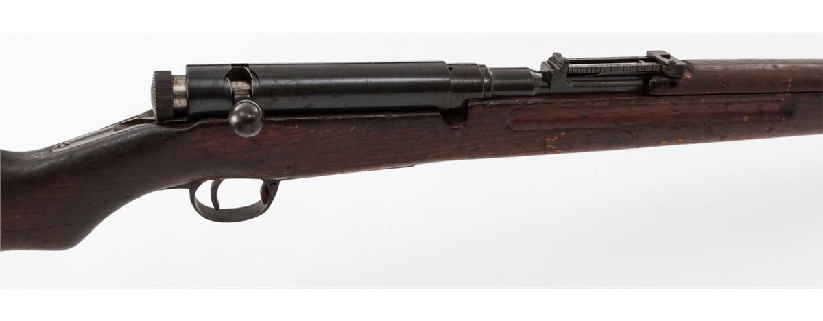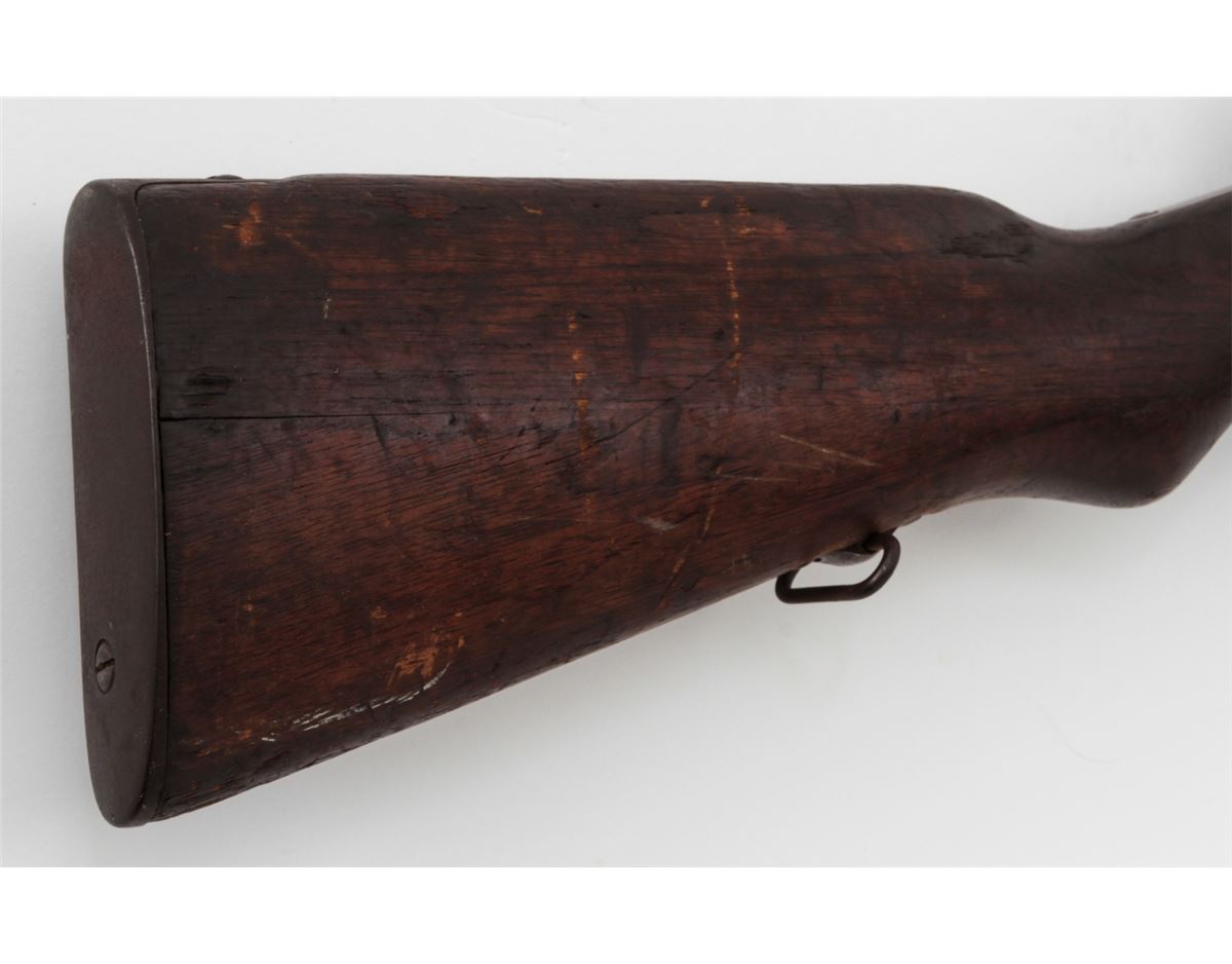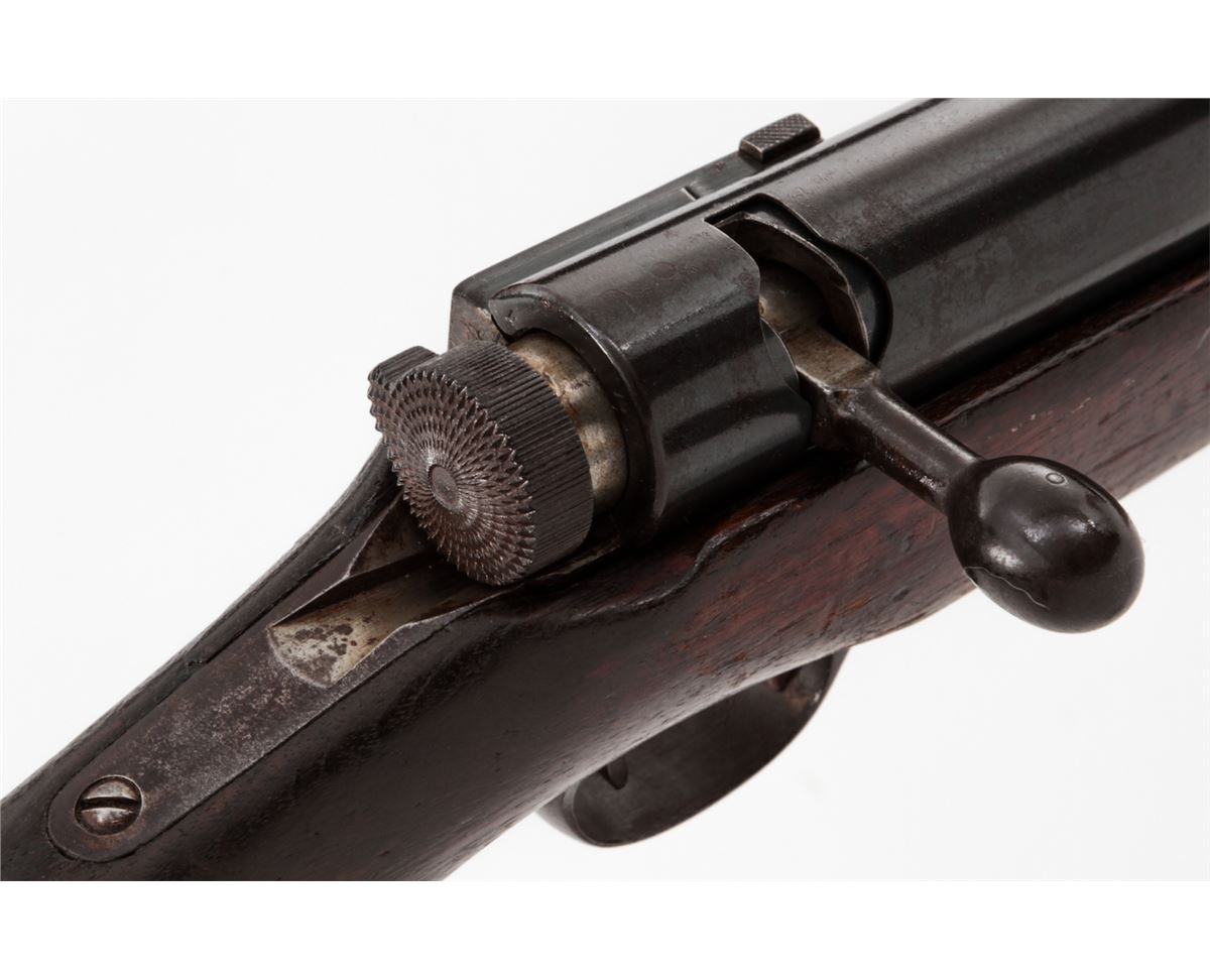 Japanese Type 38 Bolt Action Rifle, by Kokura, #1750854, 6.5mm, 31-1/2'' barrel, blue finish, Asian mahogany stock. Condition is very good retaining approx. 85% thinning and toning blue. Mum at chamber is intact; non-matching dustcover and cleaning rod are present. Stock with moderate to heavy scuffs and scratches, with one dovetail repair to left side at wrist. Action and bore are good. Est.: $350-$500. (C&R)