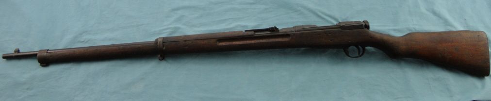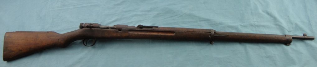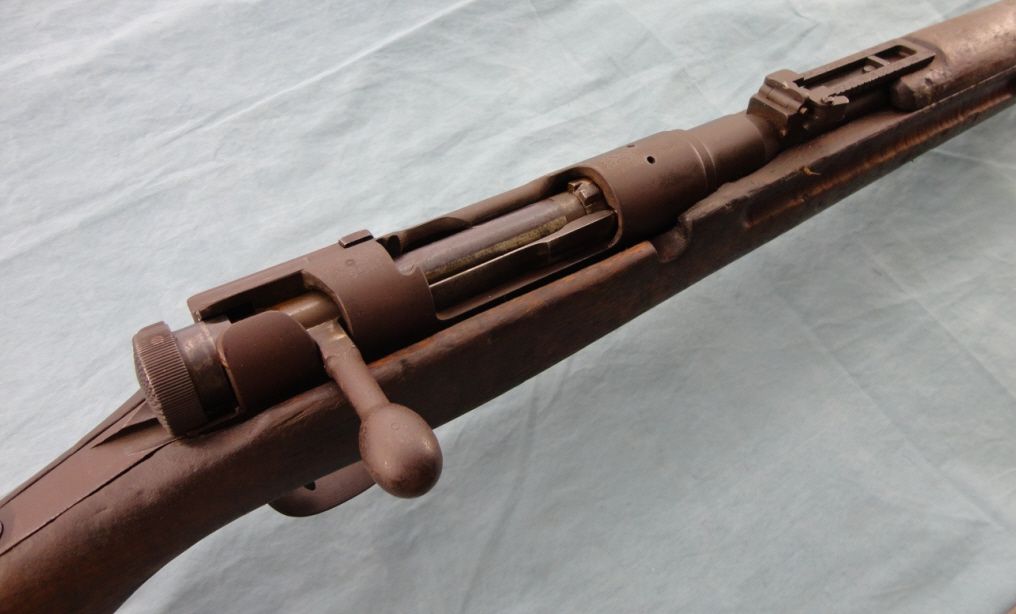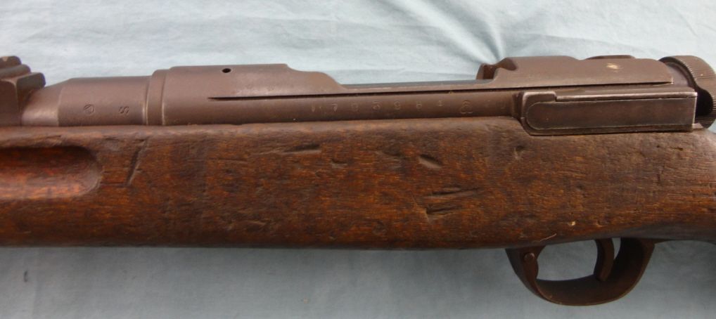 #1,793,984; 6.5 cal. Type 38 Std. Config. w/unground mum. Metal is faded to brown w/slight surface rust. Stock is heavily dented & scratched from typical use. Missing rear sling hook.