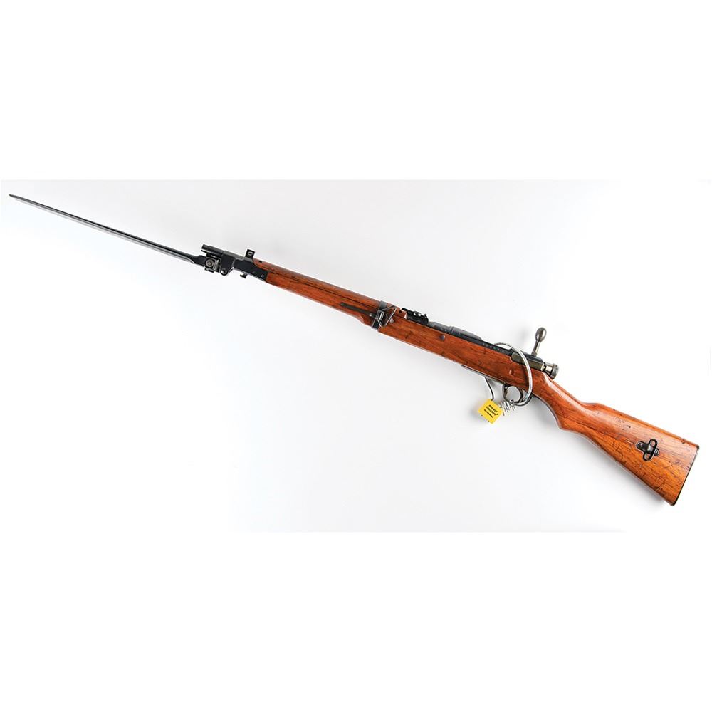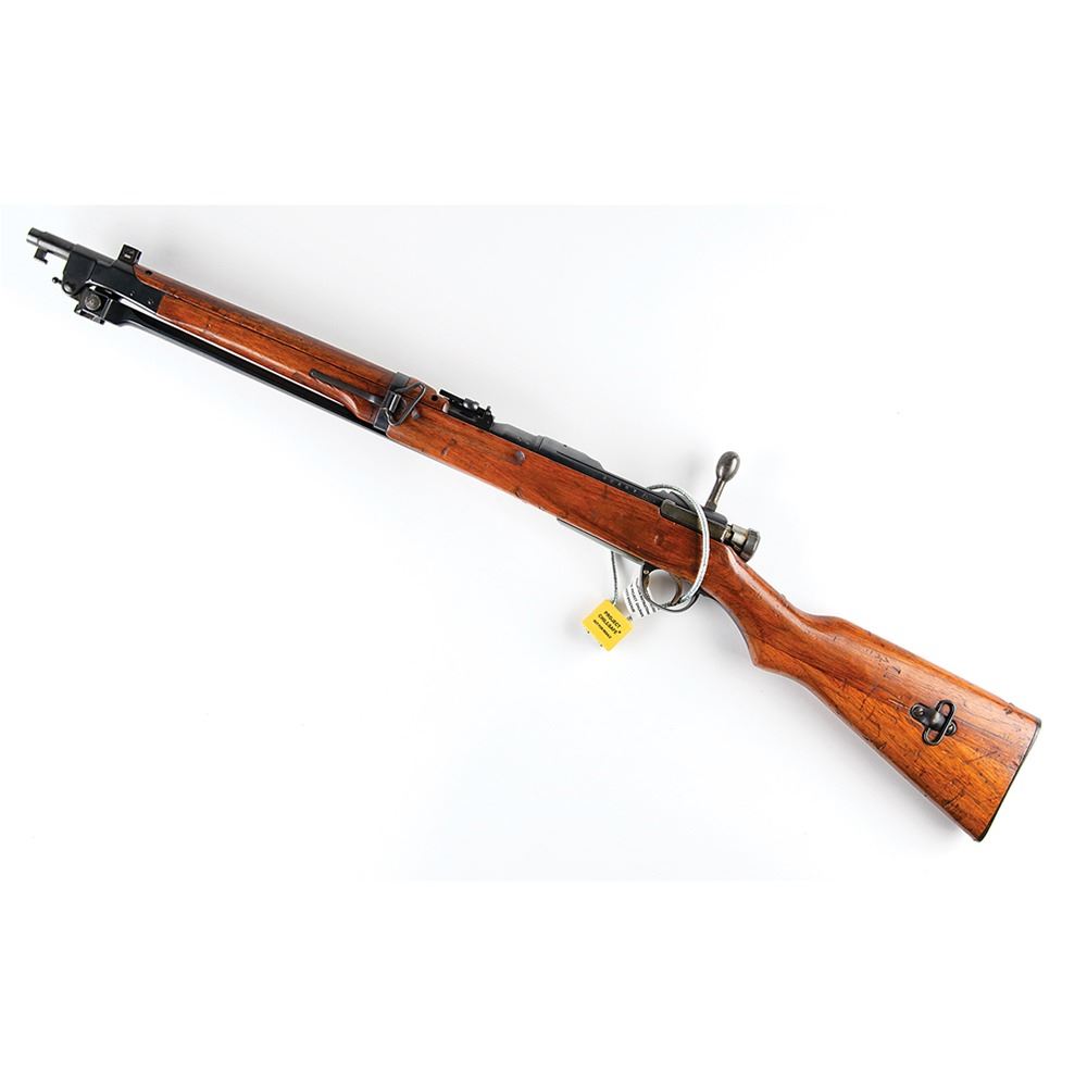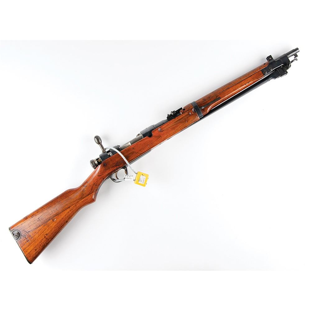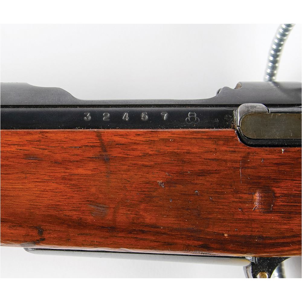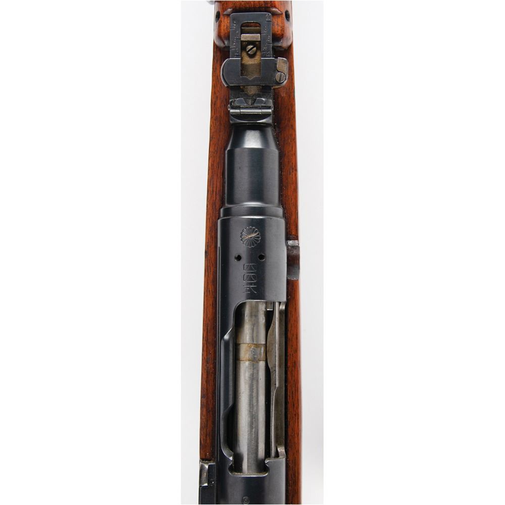 Japanese Type 44 1st Model Cavalry Carbine, serial #32457, 6.5mm Arisaka, 19" barrel with a very good bore that has some minor freckling within the grooves. This is a Koishikawa Arsenal-made carbine that has the first type short nosecap and has a slightly defaced mum, but no visible post-war import marks. The metal retains 95-97% of the original blue finish on the receiver, barrel, and folding bayonet assembly, that has silvered very slightly at the muzzle, as well as along a few of the high edges and projections. The bolt is numbered to a different rifle ("729") and is mostly in-the-white, with dried grease present along the edges and some freckling on the handle. No dust cover is present, but the bayonet assembly serial number matches the number on the bolt. The stock and handguard have numerous small handling marks and blemishes in the original varnish. This is a well preserved, early Type 44 carbine in very good-near fine condition and would make a fine addition to a collection. Transferrable under FFL or C&R.