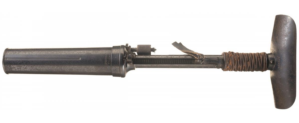 Entering service in 1929, the Type 89 launcher was a dual purpose weapon, capable of firing both the standard Type 91 fragmentation grenade for anti-personnel work, and also the Type 89 round, which was closer in potency to a true mortar round. The knee mortar designation came about due to GI's observing that the curvature of the base plate (meant for use with a tree trunk) would make a good fit for a human leg; an observation that led to a number of injuries from the heavy recoil of the weapon. Overall length is 23 3/4", with the barrel marked with the serial number over a set of arsenal proofs, the full serial number on the barrel mounting ring, main spring tube, and base, "399" on multiple small parts, the range adjustment wheel mounted to the right of the main tube, spring loaded rubberized canvas dust cover and curved base plate.