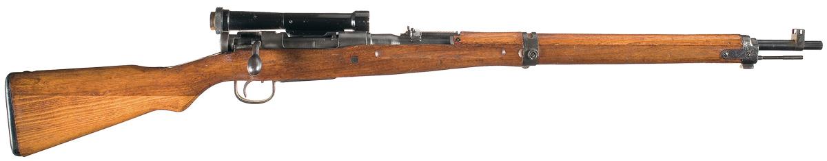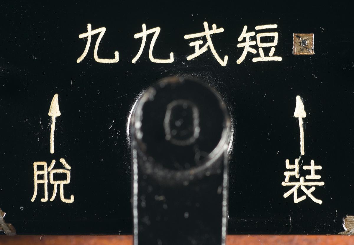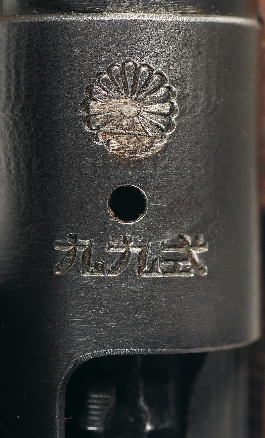 Blade front and transitional ladder rear sight with A-A bases, with a lightly struck mum on the receiver ring above the Type marking and the Nagoya stamp over the serial number at the rear of the frame. All visible numbers are matching. Mounted on the left side of the receiver is the scope rail, with a 4x scope numbered "6157" on the exterior, "1060" and "200" internally. Smooth pistol grip stock, with sling swivels and a cupped buttplate.