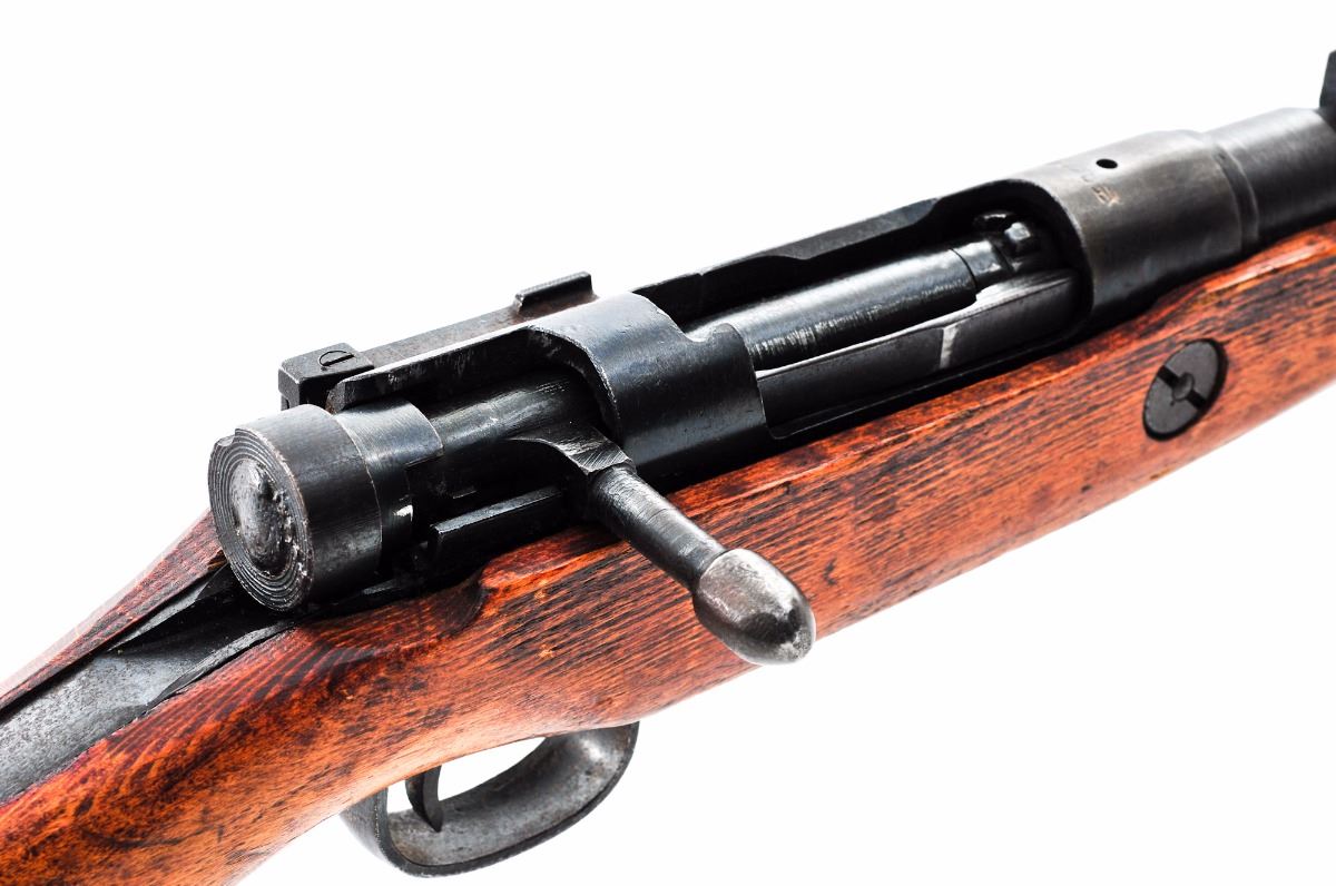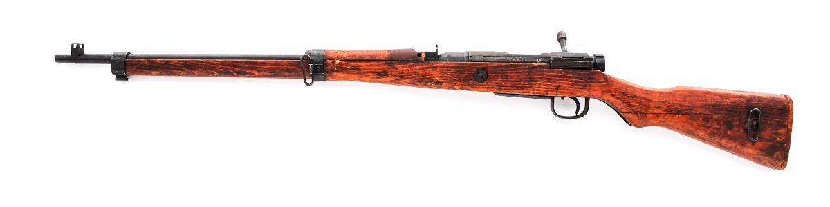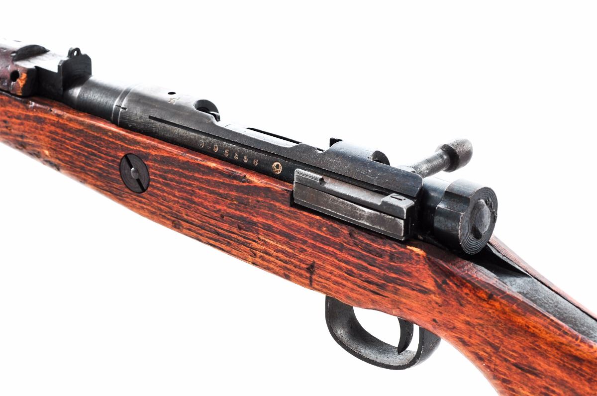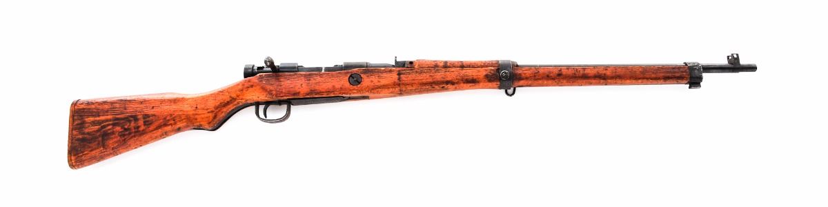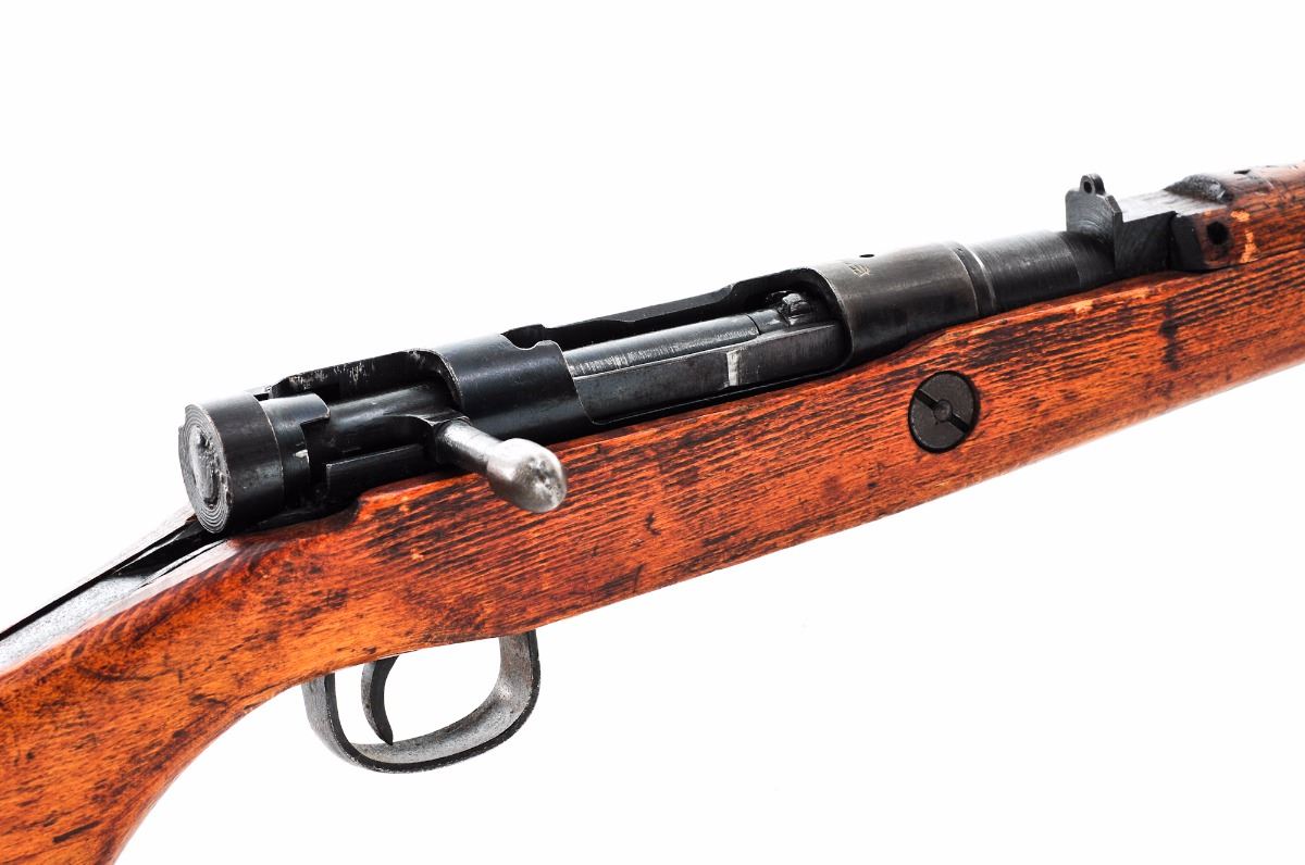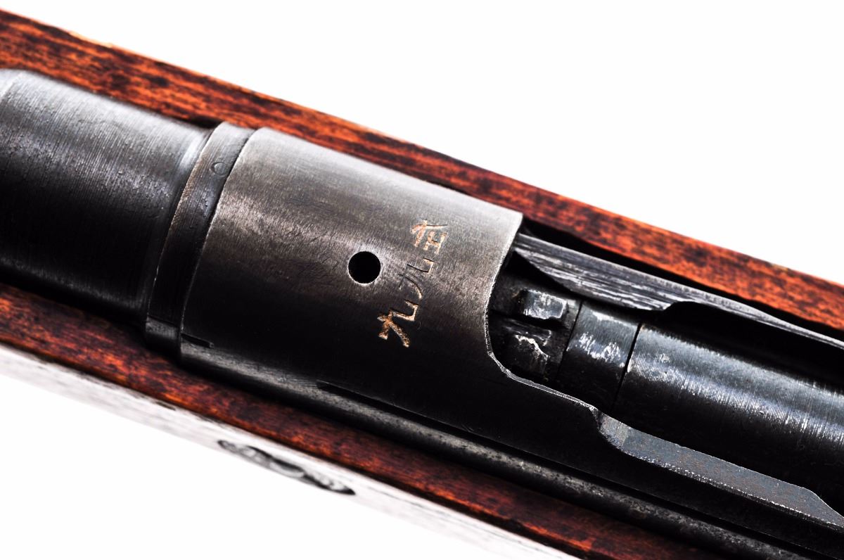 Japanese Type 99 ''Last Ditch'' Bolt Action Rifle, by Nagoya Arsenal, #95556, 7.7mm, 26'' barrel, blue finish, pistol-grip hardwood stock, standard Last Ditch type sights, with wood buttplate and sling swivels.  Mum has been ground.  Condition is good retaining approx. 70% blue that has darkening considerably.  Stock has been lightly sanded with an additional coat of aging varnish.  Many small parts are crudely cast as you would expect from a Last Ditch rifle and some with surface rust.  Bolt, extractor and receiver with matching serial numbers.  Action is tight, bore is fine with light frosting.  Est.:  $150-$300.  (C&R)