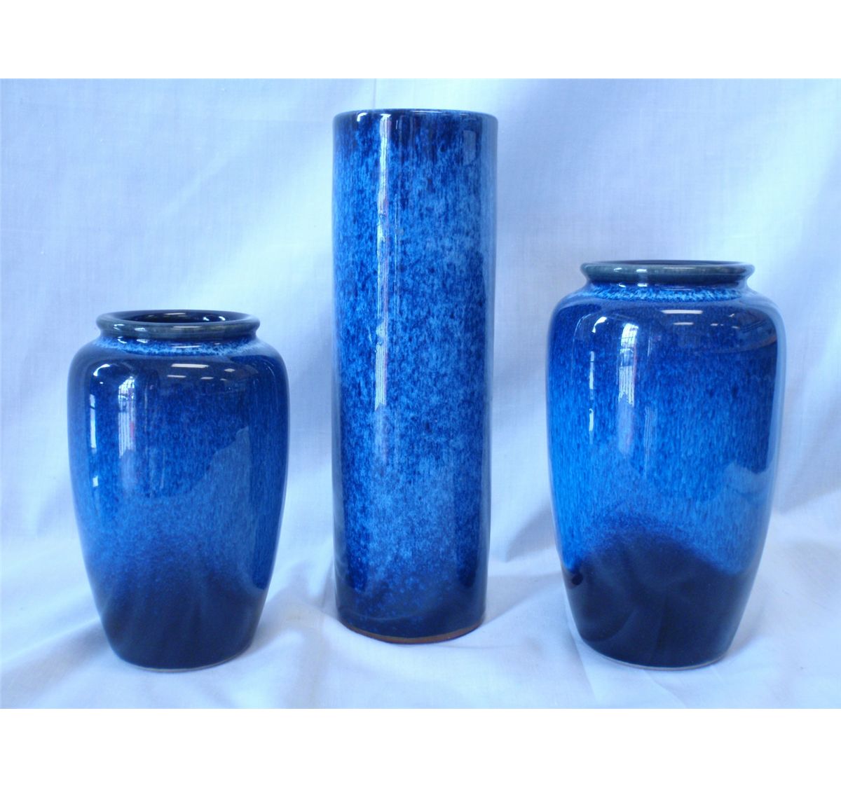 Matched set of three Japanese vases. Ca. 1950's- 60's. Two have maker's marks. Excellent condition, no chips. Some staining inside from use. 10 x 3 -- 7 1/4" x 3" -- 6 1/4" x 3 3/4" Shipping on this lot: $20.00. Additional Shipping Charges for Lots sent outside of the U.S