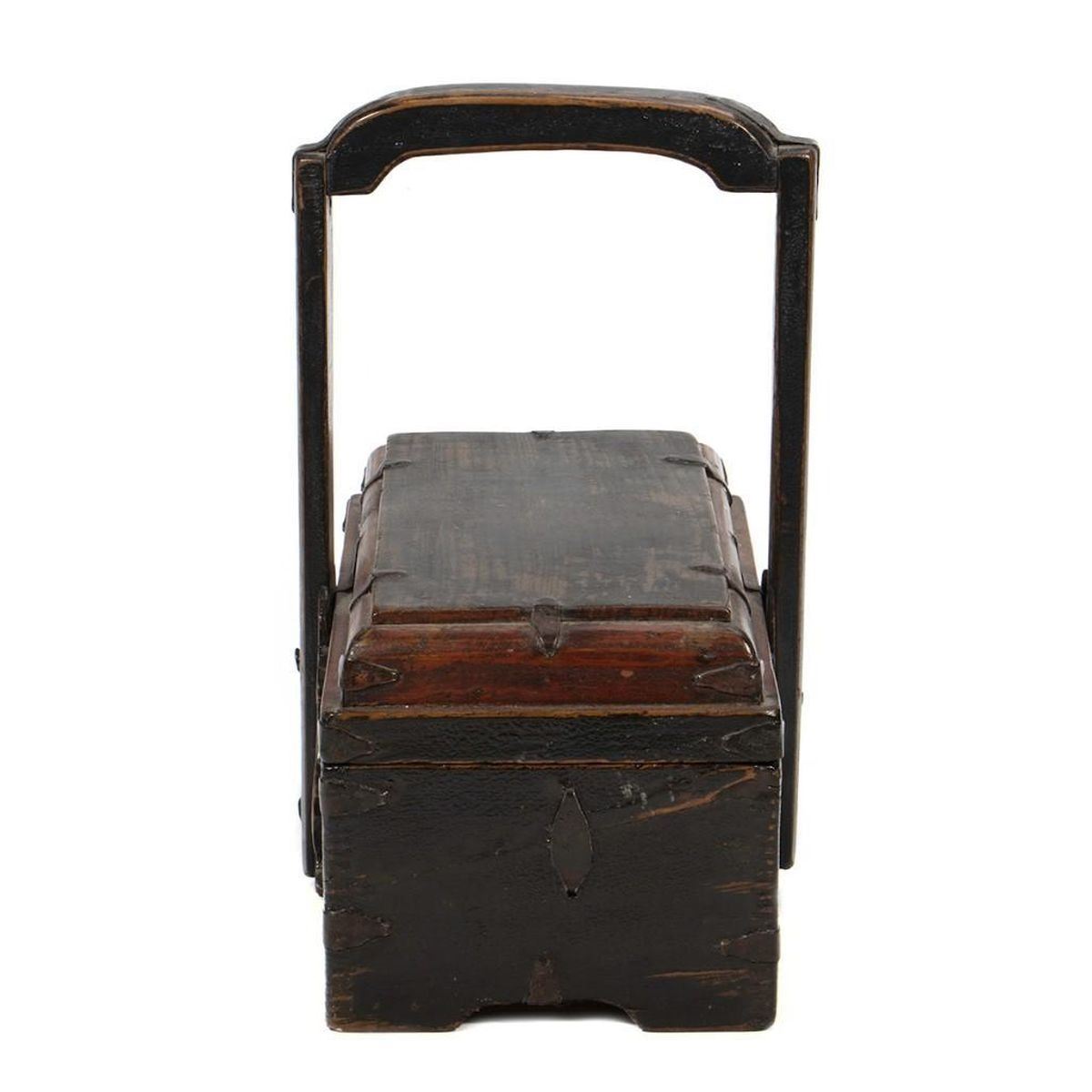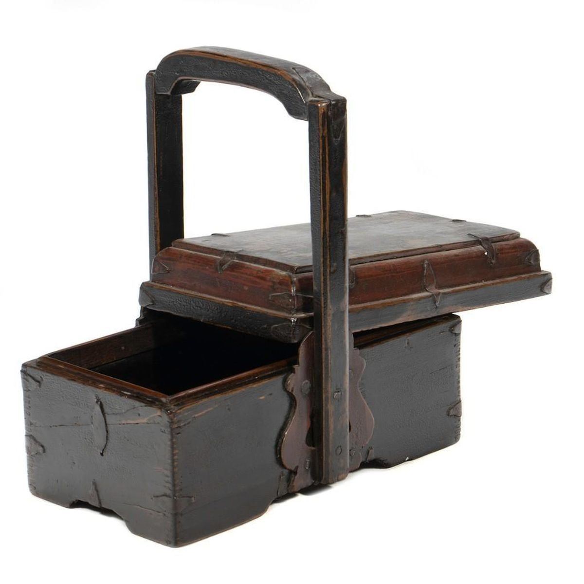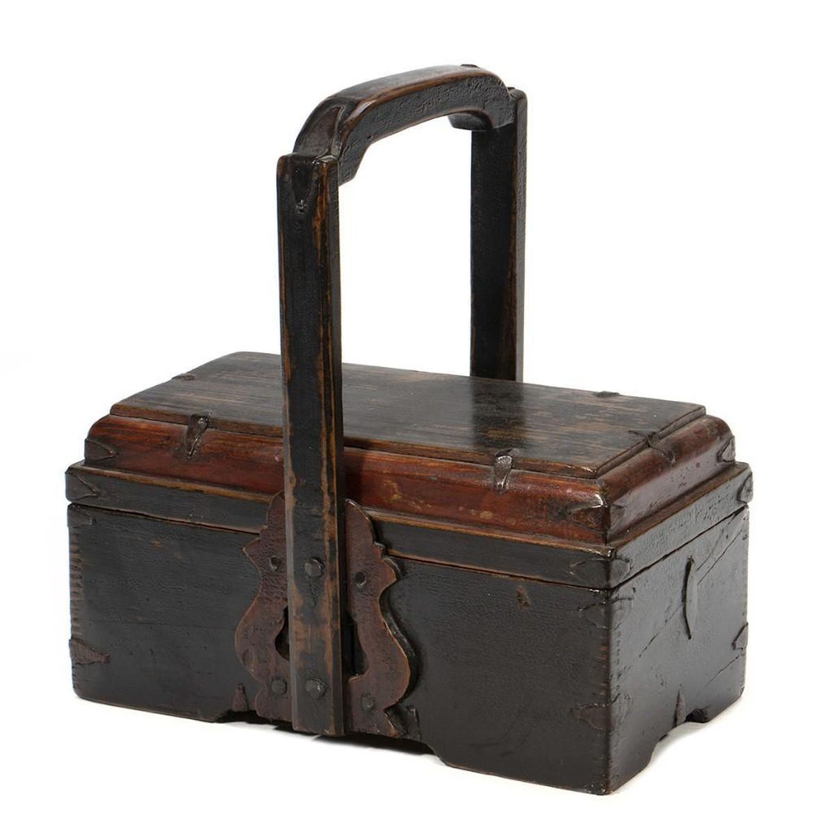 With lift off lid and fixed handle. Height to top of handle 15in. length 13in. Condition: Very good