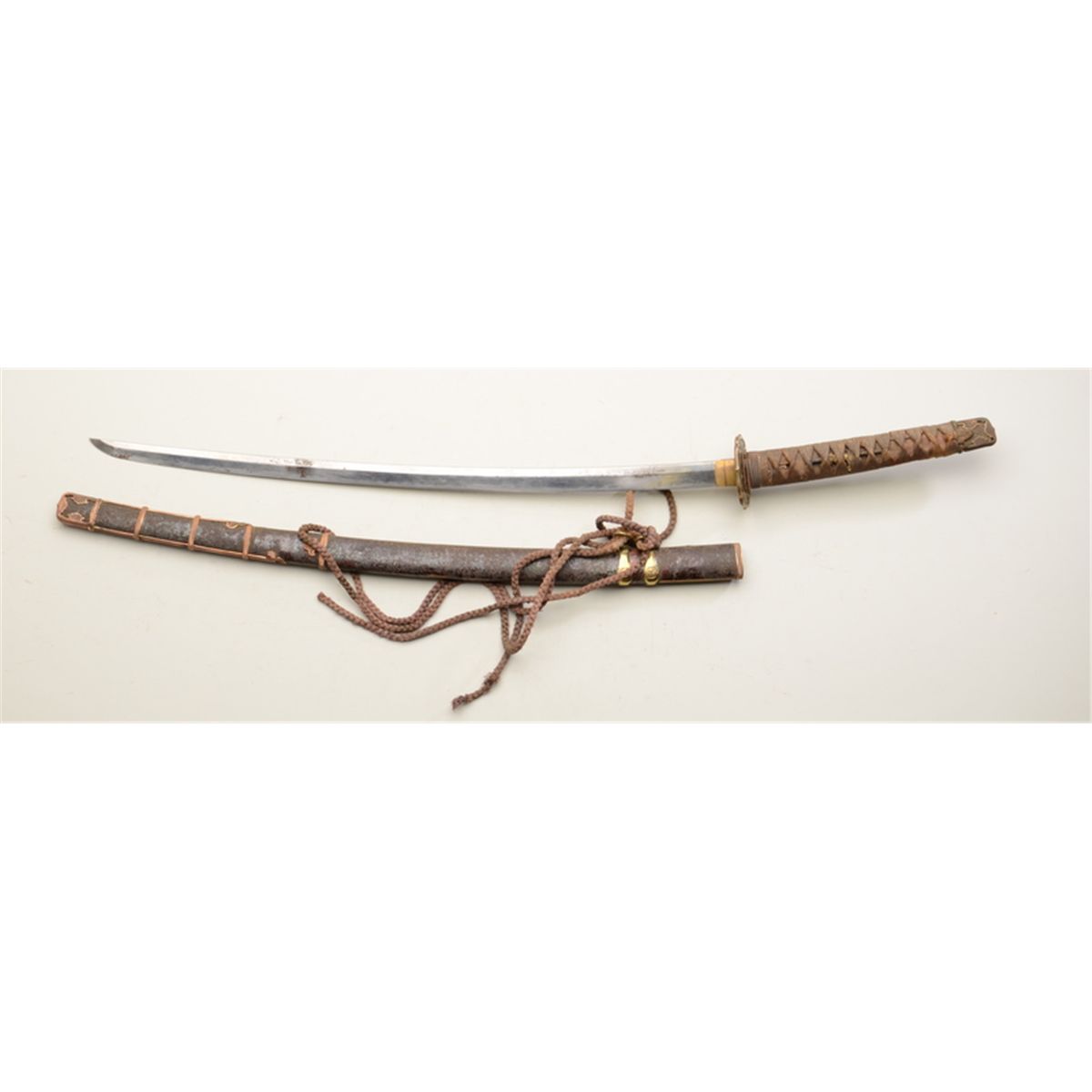 Japanese WW II Officer’s sword with traditional mounts and scabbard; blade is overall good with a visible temper line, nice tsuba and menuki; fair cord wrap; majority of ray skin missing; scabbard is overall good and set is accompanied by a wound hanging rope. Est.: $400-$800.