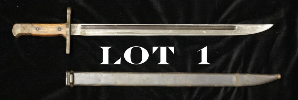 Japanese WW II era bayonet and metal scabbard in overall untouched condition; blade is good, scabbard shows scattered erosion and pitting and a couple dents. Est.: $25-$50.