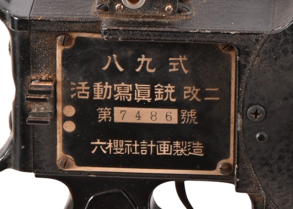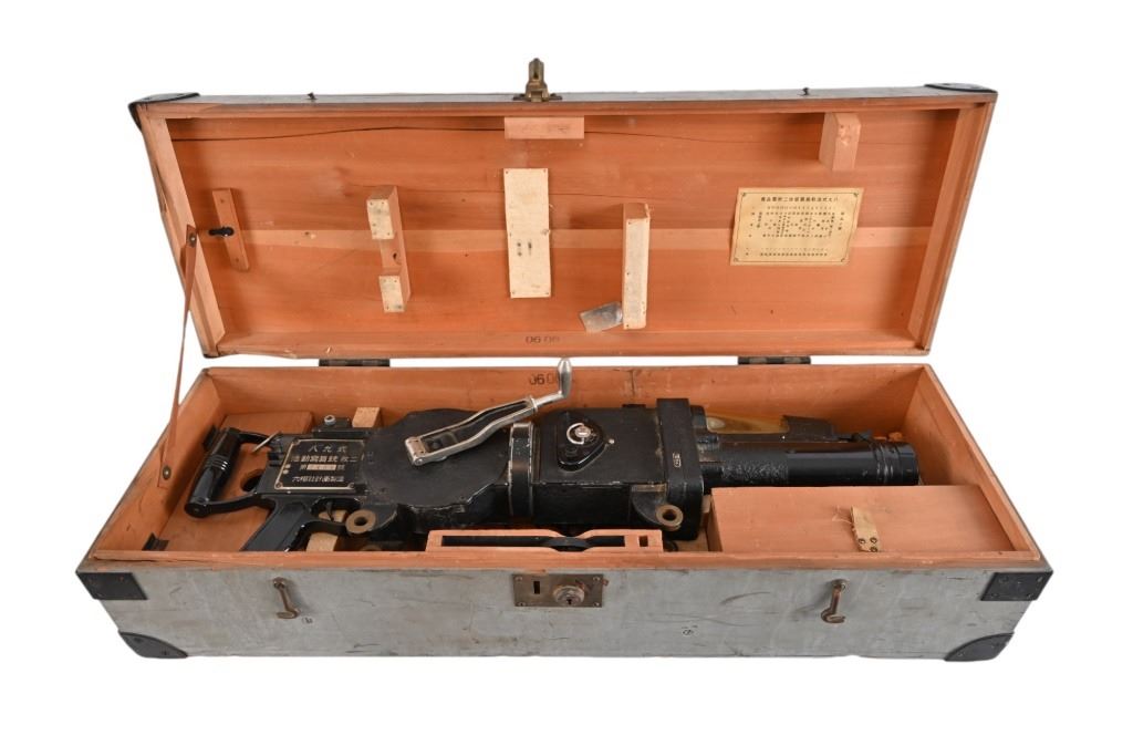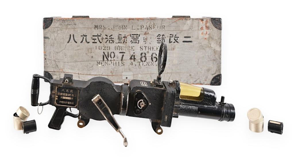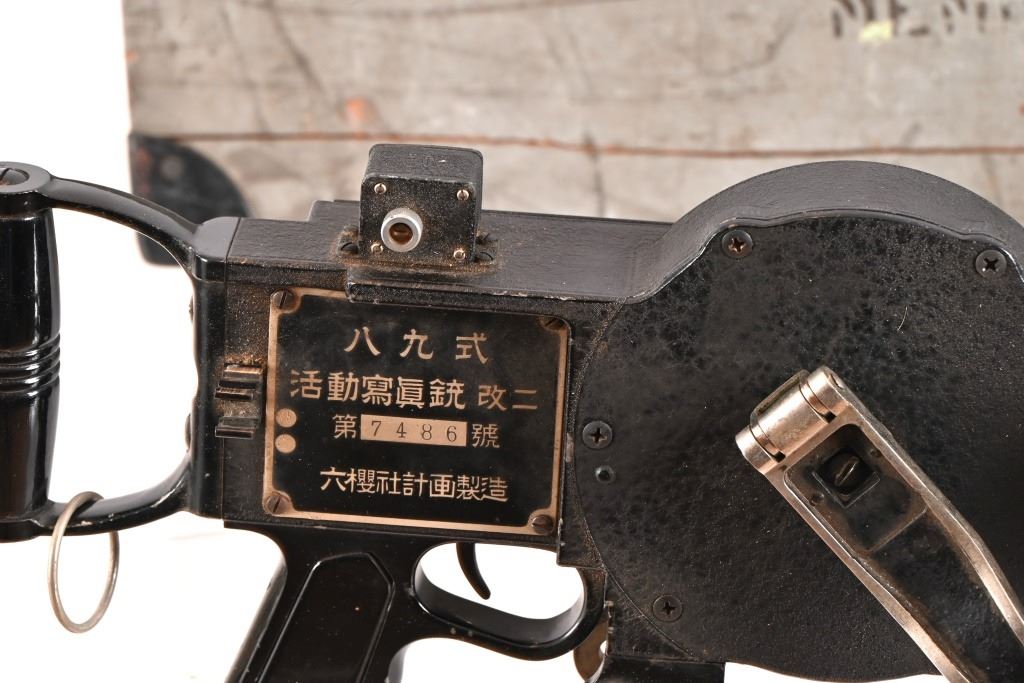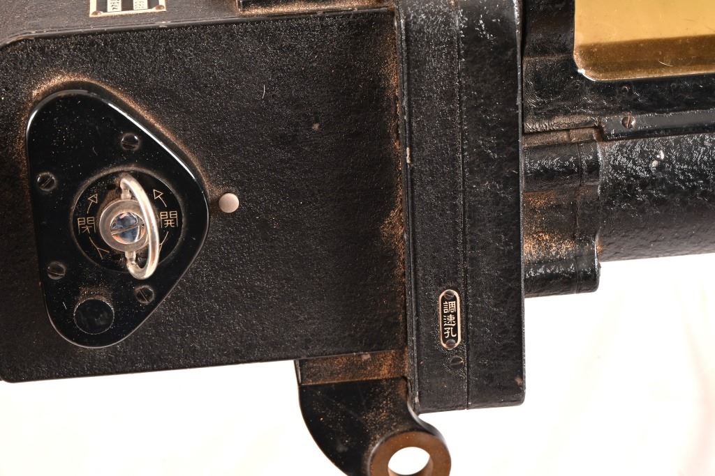 Konica Konishiroku Rukoah-Sha (Konica-Minolta) Type 89 Japanese Machine Gun Camera. Made by Konishoruko (which later became Konica) for training Japanese airplane gunners during World War II. In original wood transit case