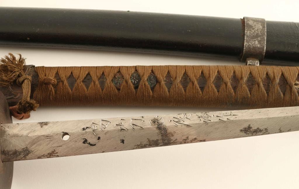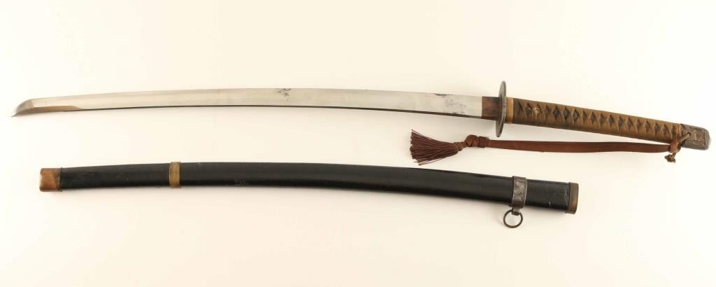 Cloth wrapped grips with tassel, with original scabbard which has been repainted, arsenal marked tang under tang blade is excellent with some light pitting 26" blade.
