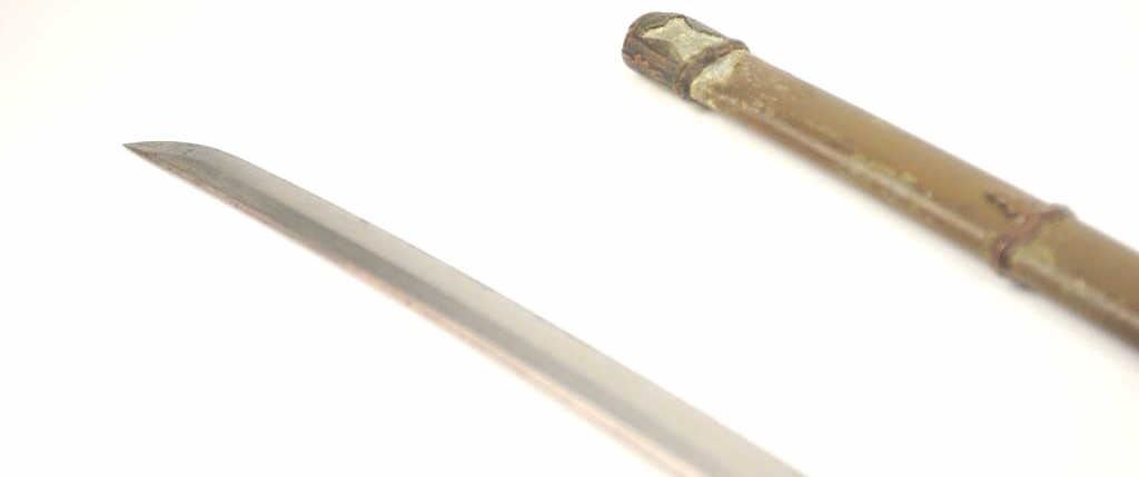 Japanese WWII Era “Samurai” sword in military mounts. The handle is missing ray skin and unraveling with blue and brown condition. The blade measures 26 ½” only showing incorrect cleaning and pits along with flaws. 8 ½” long old tang with 1 hole and showing intricate and lengthy signature. The tang also cleaned incorrectly but just slightly. 300-600 year old blade temper line mostly not visible. Est.: $400-$800