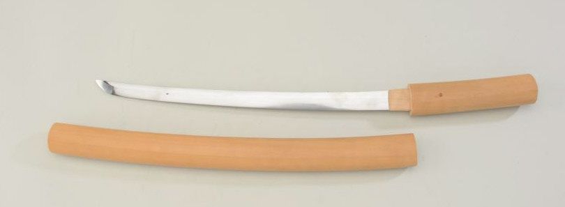 Japanese Wakasashi in in sira-siyh, or storage case. The blade measures 16" in length and is unsigned. Old tag attributes Koto Shinto (period) Bizen (provence), and another tag #845 attributes maker to SadatSugo 1681. We cannot verify info other than from sword appraisal through club 30 years ago or more. The blade is in good state of polish with 2 flaws or kizu's in the lamination 1-4 1/2" back on the left side(very small), the other is 7 1/2" back on the top right side_ both above the temper line. Otherwise good to very good with fancy temper line. Est. $400-800.