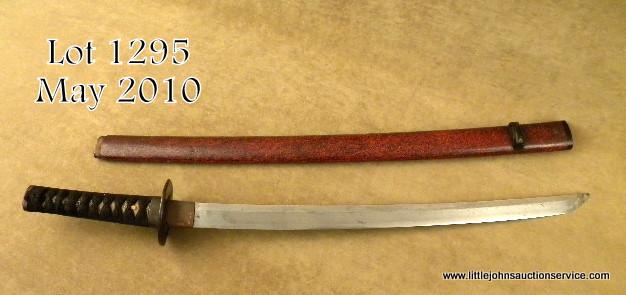 Japanese Wakizashi or medium sized sword in tradition Samurai mounts with 18" blade. Blade signed on both sides. Shows remounting. Good condition. Estimated age of blade: 200-400 years old. Shows old hand-forged iron tsuba, temper line visible. Tip slightly chipped. Edge good. Some minor scratching, just beginning erosion in a couple of areas of small spidery rust. Est: $350 - $700