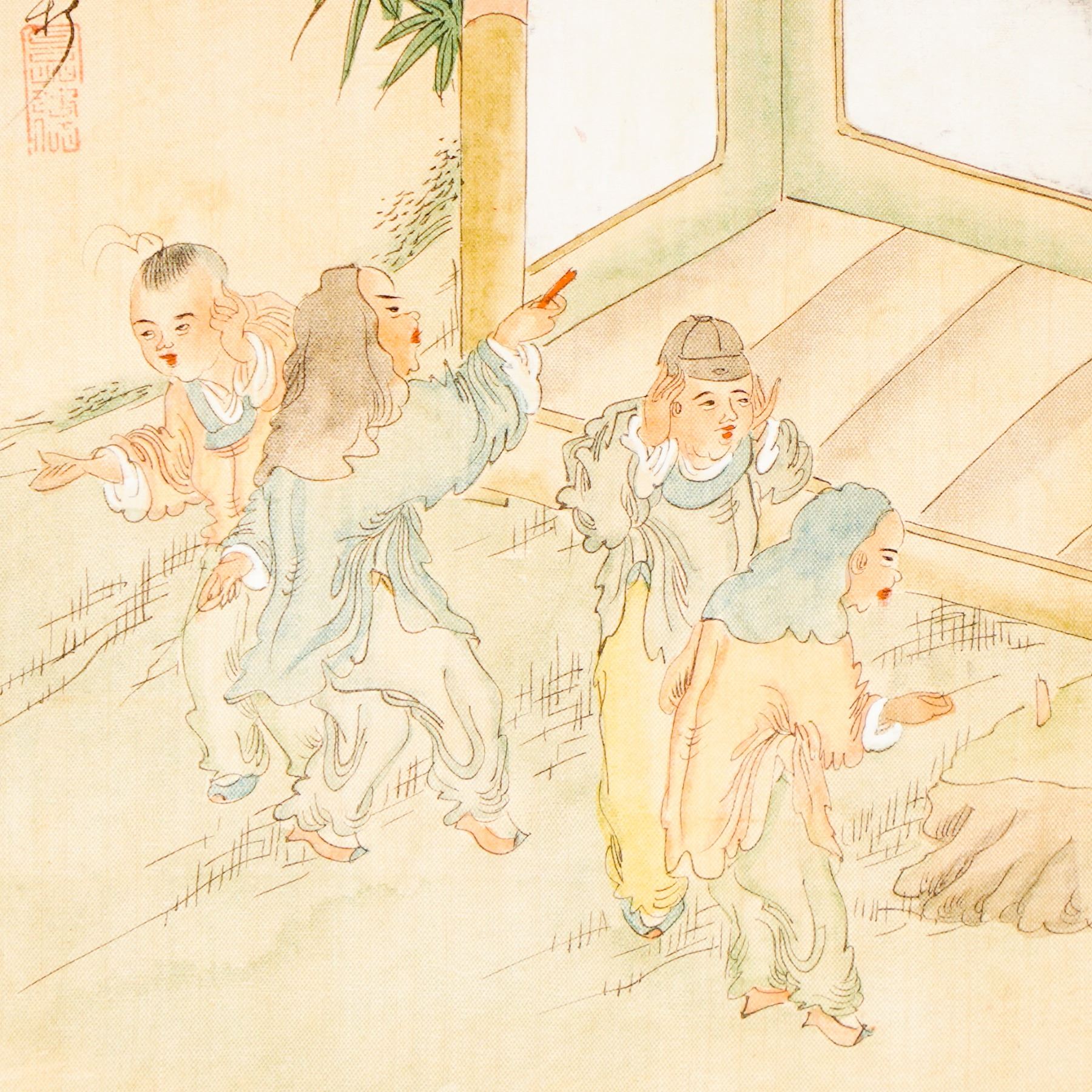 Framed Japanese watercolor painting depicting four children engaged in play near a traditional architectural setting, likely a veranda or tea house, with bamboo in the background. The composition includes delicate ink and watercolor detailing, accompanied by vertical kanji inscriptions and red seals along the left and right sides, indicating a classical Japanese style. This piece is double-matted in cream and dark gray and presented in a gold-tone wooden frame.