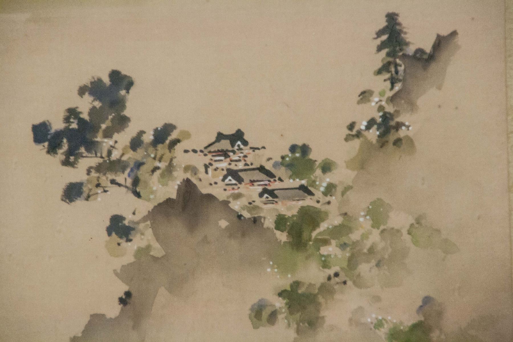 Watercolor and ink on paper, framed, featuring mountainous landscape, signed by artist, inscribed with 1 artist seal, 82 x 35 cm