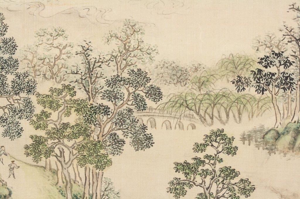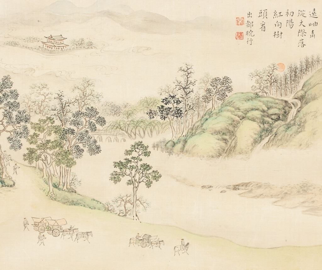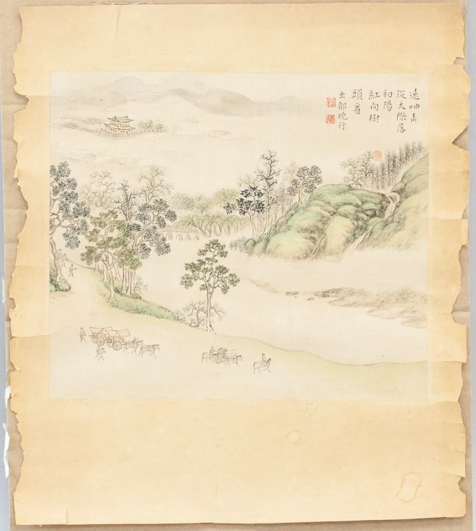 Japanese watercolor on silk. Featuring sunrise landscape scene. Inscribed with two seals. 22 x 26 cm.