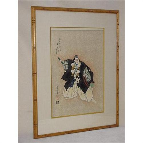 A Japanese wood block print, 22 3/4" X 17", of a nobleman in traditional dress holding a scroll in his right hand as he would hold a sword. The print is in good condition, it is framed in a bamboo style frame with silk mat. Print should be realigned in the frame. Chop marks on print indicate maker.