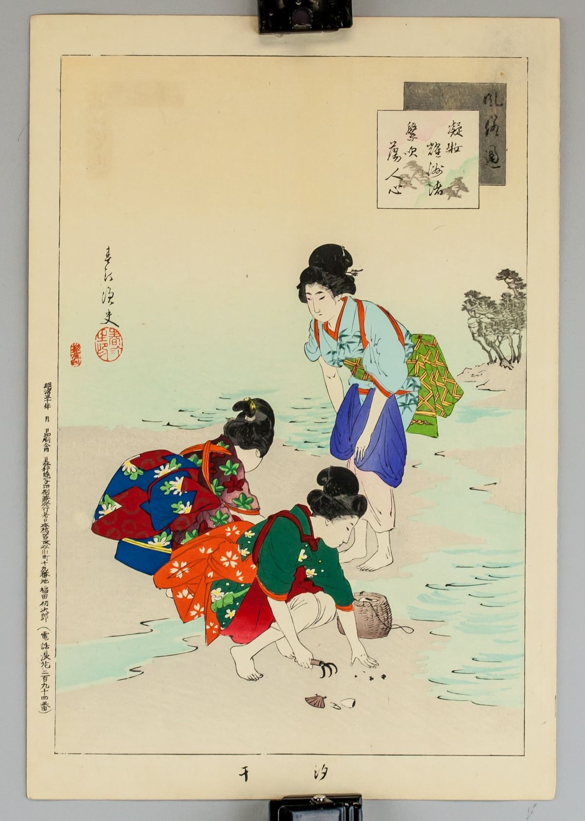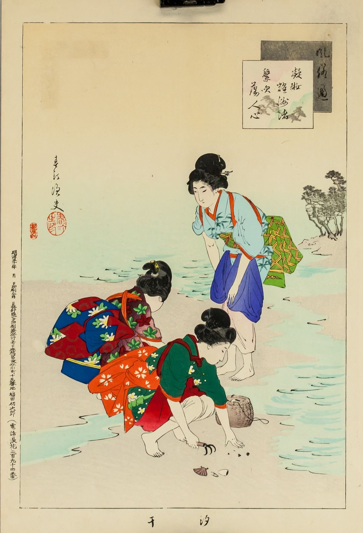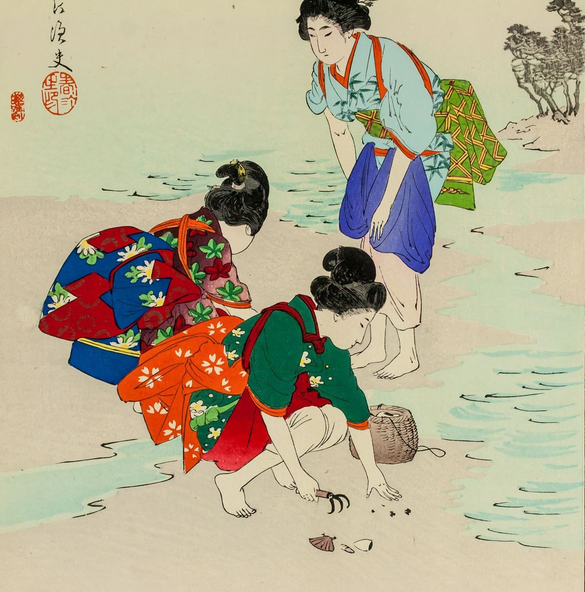 Japanese woodblock print. "Shellfish Gathering" Shuntei. Of the Customs of Women series. Dated 1897. Accompanied with a certificate letter of authenticity from RONIN GALLERY LLC (425 Madison Avenue 10th floor, New York, New York, 10017. 35 x 25 cm. PROVENANCE: Ronin Gallery LLC (New York, United States). Acquired from above by current owner (Canada)