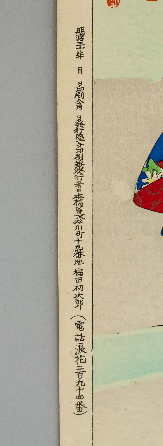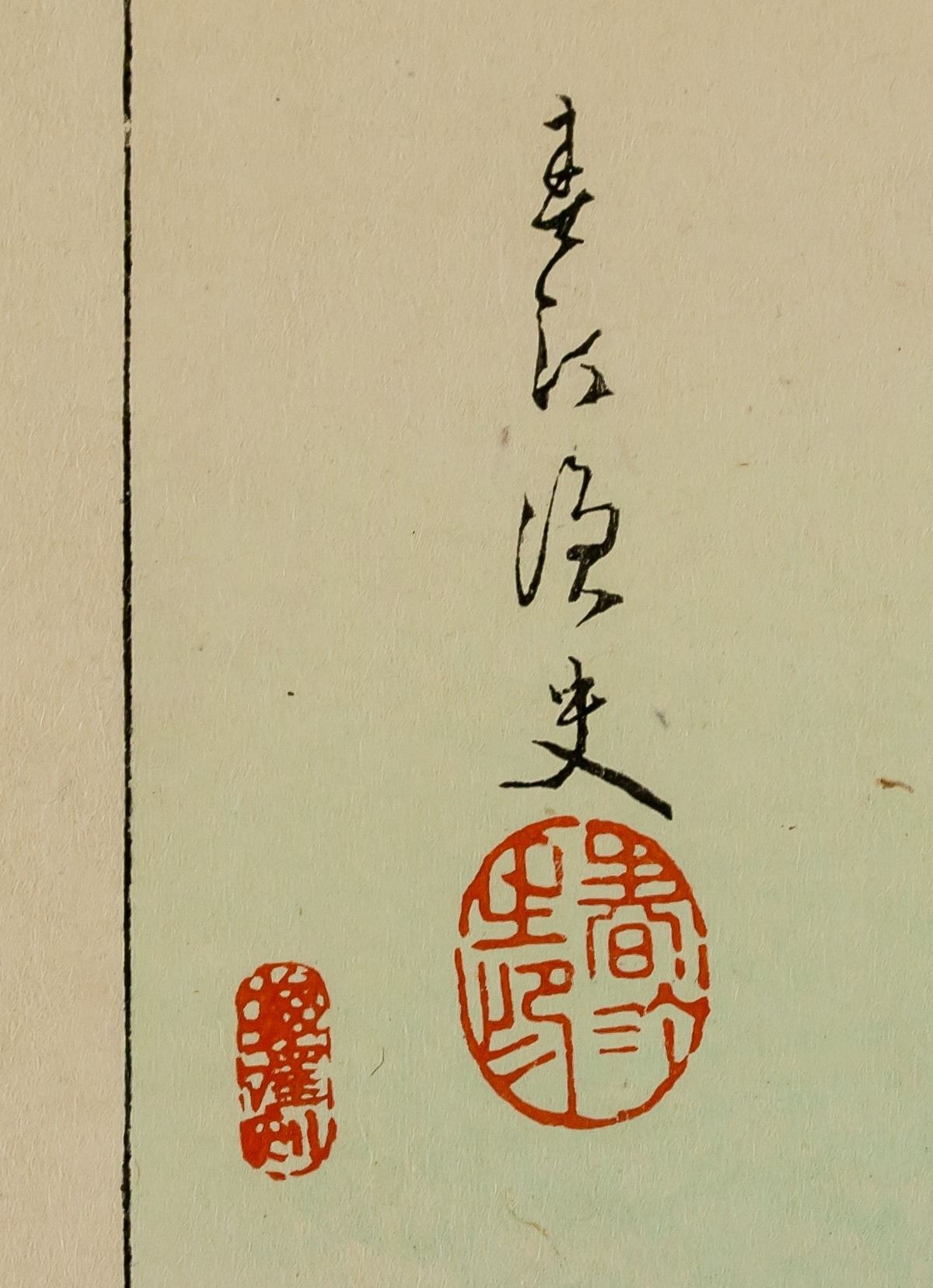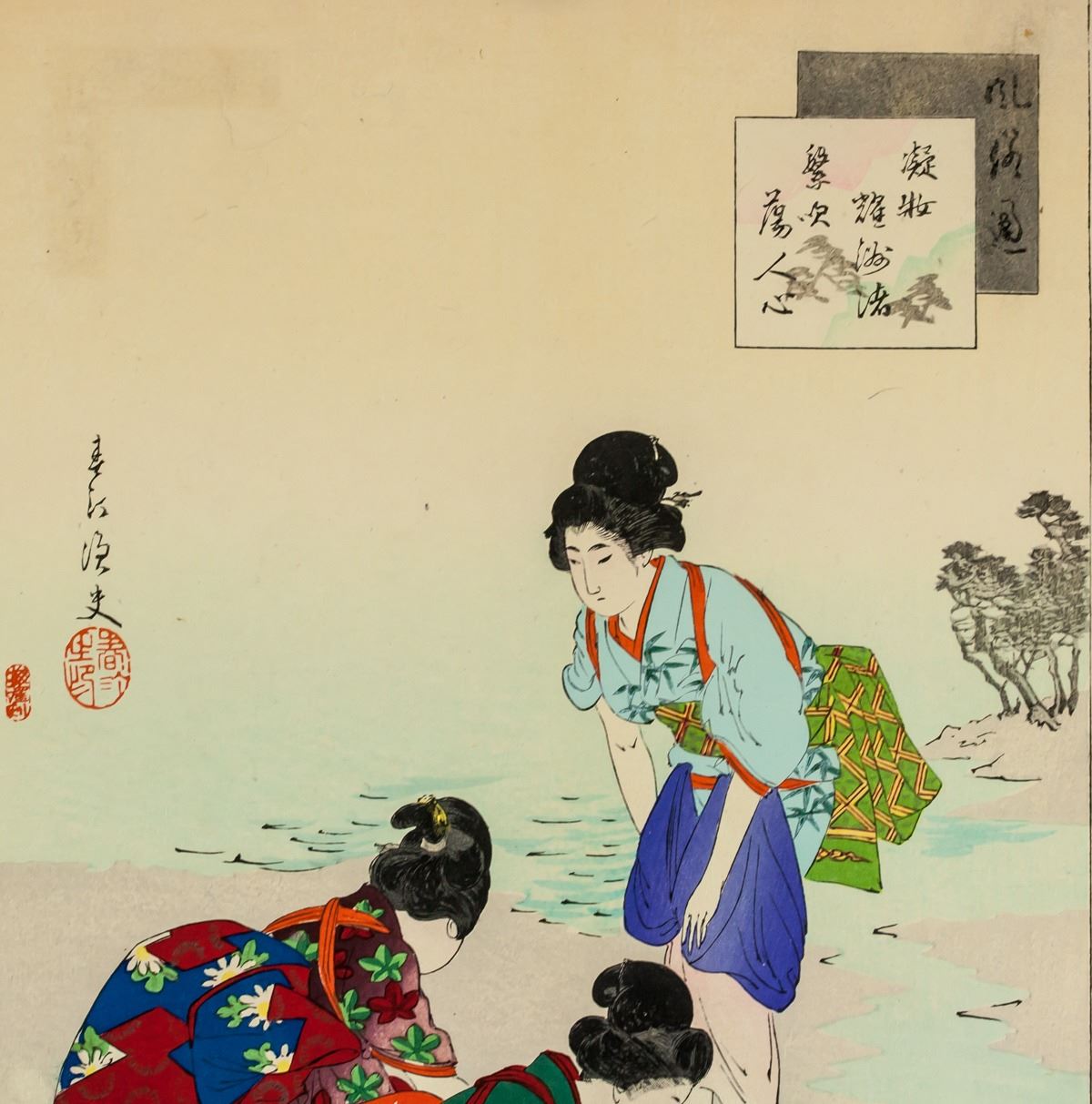 Japanese woodblock print. "Shellfish Gathering" Shuntei. Of the Customs of Women series. Dated 1897. Accompanied with a certificate letter of authenticity from RONIN GALLERY LLC (425 Madison Avenue 10th floor, New York, New York, 10017. 35 x 25 cm. PROVENANCE: Ronin Gallery LLC (New York, United States). Acquired from above by current owner (Canada)