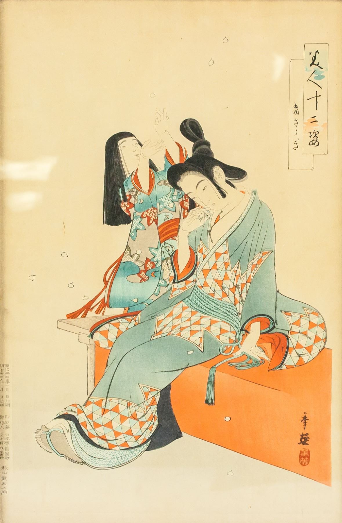 Woodblock print on paper, framed. Featuring beauty and attendant. Signed Chinese character Ji Ying. 36.5 x 24 cm, Framed Size: 39 x 26.5 cm