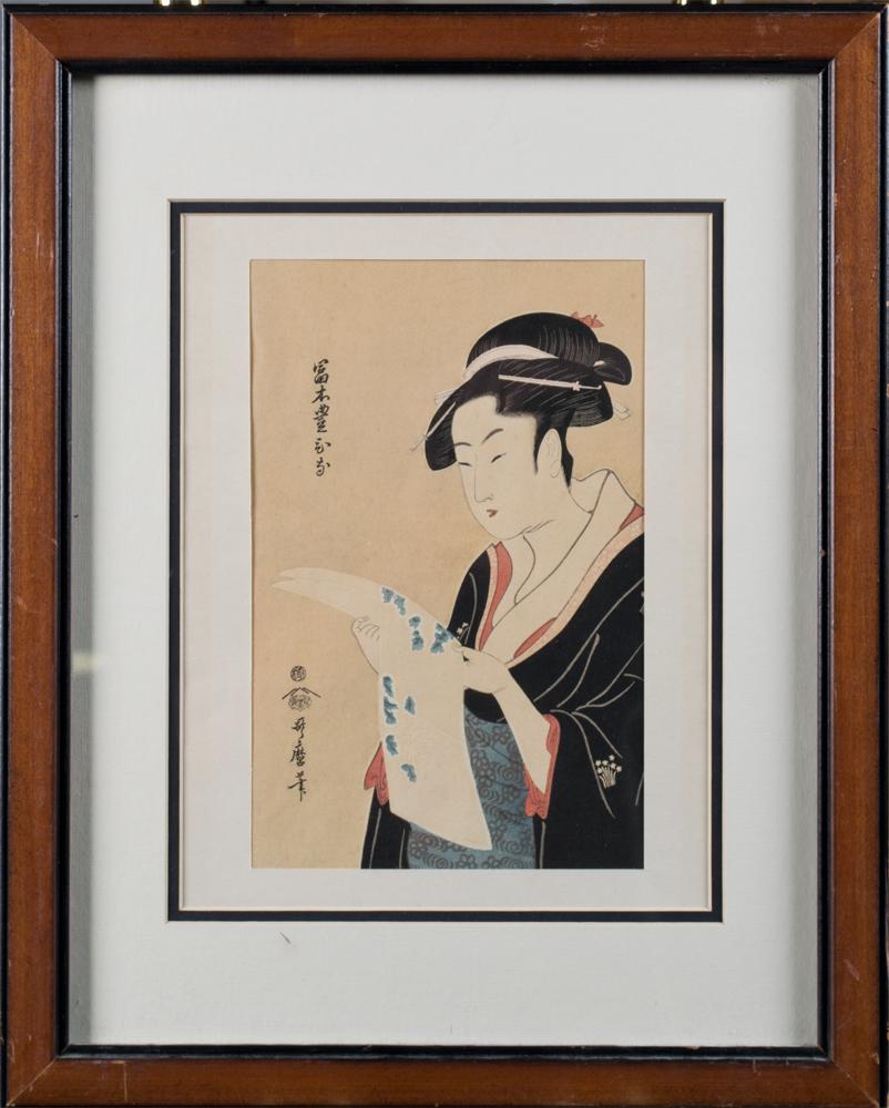Depicting a beauty reading a scroll signed and sealed upper and lower left, 11"H X 7"W sight nicely framed and matted circa early 20th century.