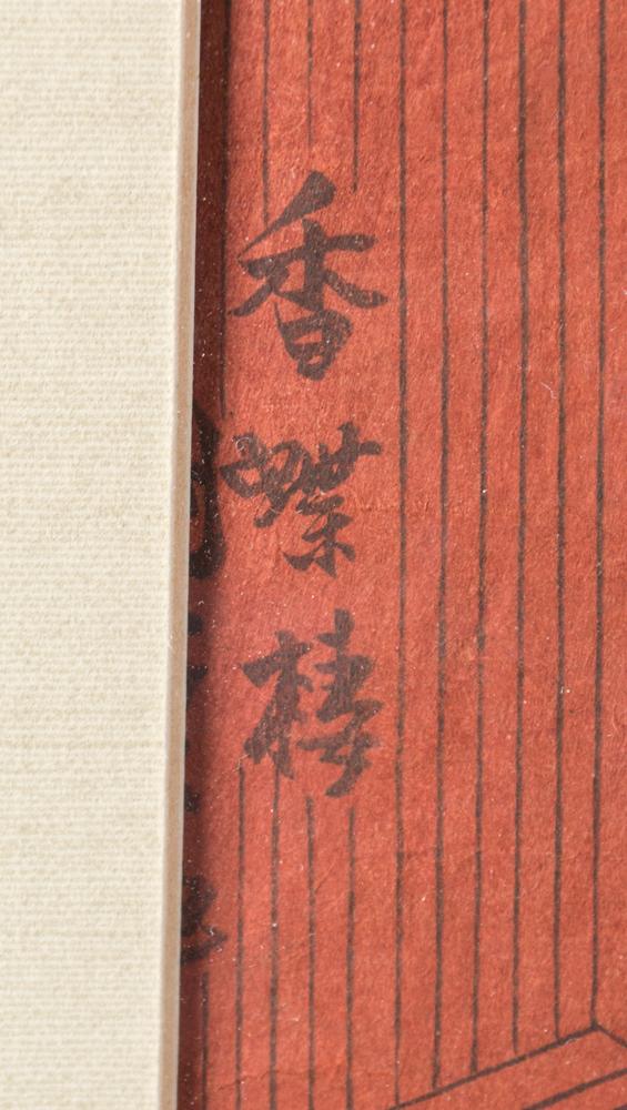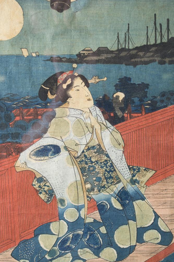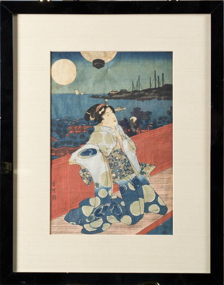 Depicting a geisha kneeling in rich blue and reds, framed sight all stamps and signature not visible, condition shows some toning and light stains throughout yet no obvious tears or damages, circa 1790-1840.