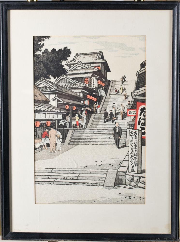 Titled "The Souvenir Shops in Nara" This very contemporary 1950's looking image of figures in a market place with one of the modern turn woodblocks taken in mid century. Frame and print in good condition sight. Circa med 20th century.